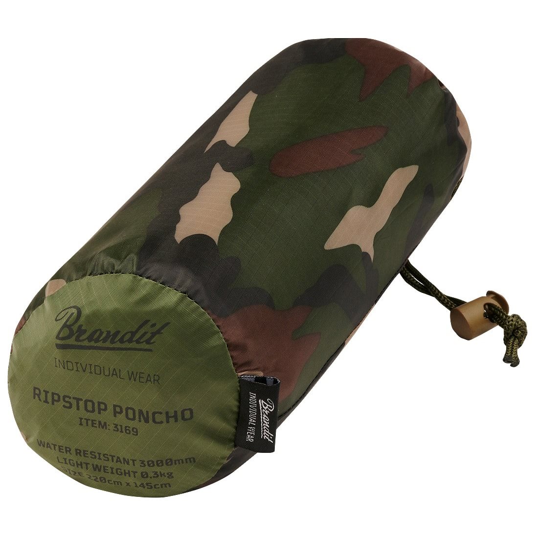 Poncho leggero realizzato in robusto tessuto poliestere con finitura rip-stop. Il poncho è dotato di otto bottoni a pressione e sei passanti metallici, che consentono di utilizzarlo come telo o per costruire un riparo improvvisato in caso di necessità. Il cappuccio del poncho è profondo e regolabile tramite un cordino con fermo in plastica. Il poncho viene fornito con una custodia per il trasporto.
