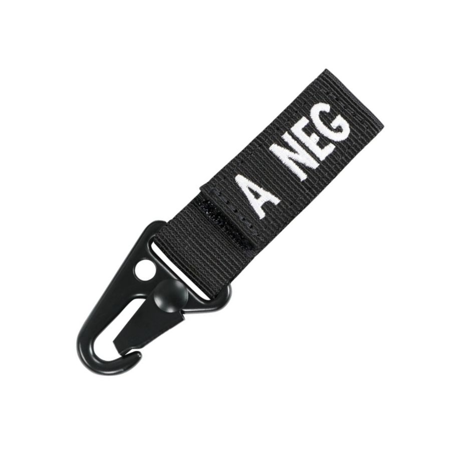 Portachiavi con indicazione del gruppo sanguigno e del fattore RH del portatore. Può essere utilizzato su cintura, PALS, chiavi o molti altri oggetti. Si fissa tramite una clip metallica a coccodrillo o infilandolo. Larghezza del foro: 5 cm.