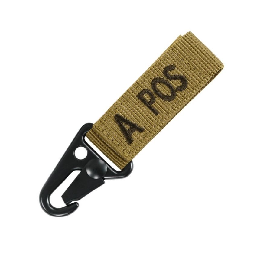 Portachiavi con indicazione del gruppo sanguigno e del fattore RH del portatore. Può essere utilizzato su cintura, PALS, chiavi o molti altri oggetti. Si fissa tramite clip metallica a coccodrillo o infilandolo. Larghezza del foro: 5 cm.