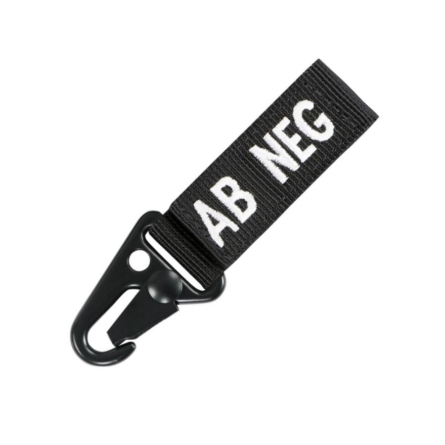 Portachiavi con indicazione del gruppo sanguigno e del fattore RH del portatore. Può essere utilizzato su cintura, PALS, chiavi o molti altri oggetti. Si fissa tramite una clip metallica a coccodrillo o infilandolo. Larghezza del foro: 5 cm.