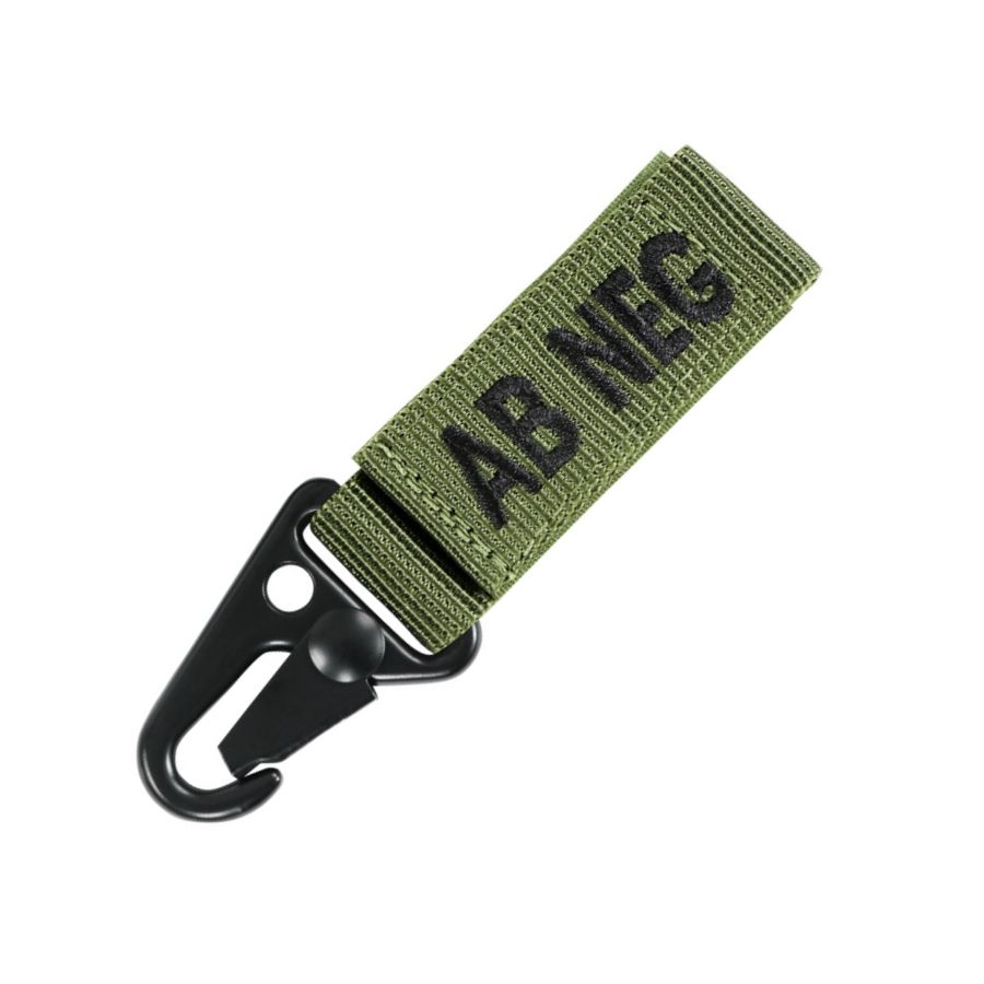Portachiavi con indicazione del gruppo sanguigno e del fattore RH del portatore. Può essere utilizzato su cintura, PALS, chiavi o molti altri oggetti. Si fissa tramite una clip metallica a coccodrillo o infilandolo. Larghezza del foro: 5 cm.