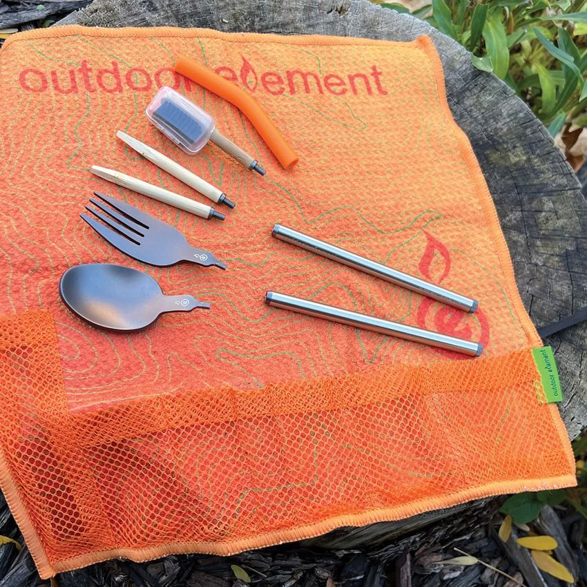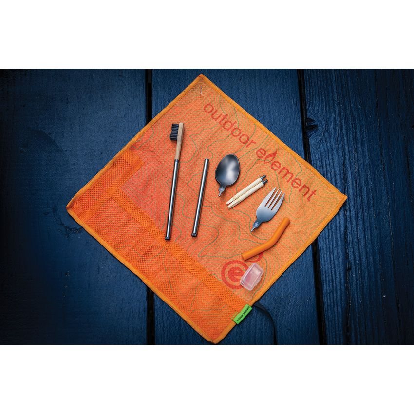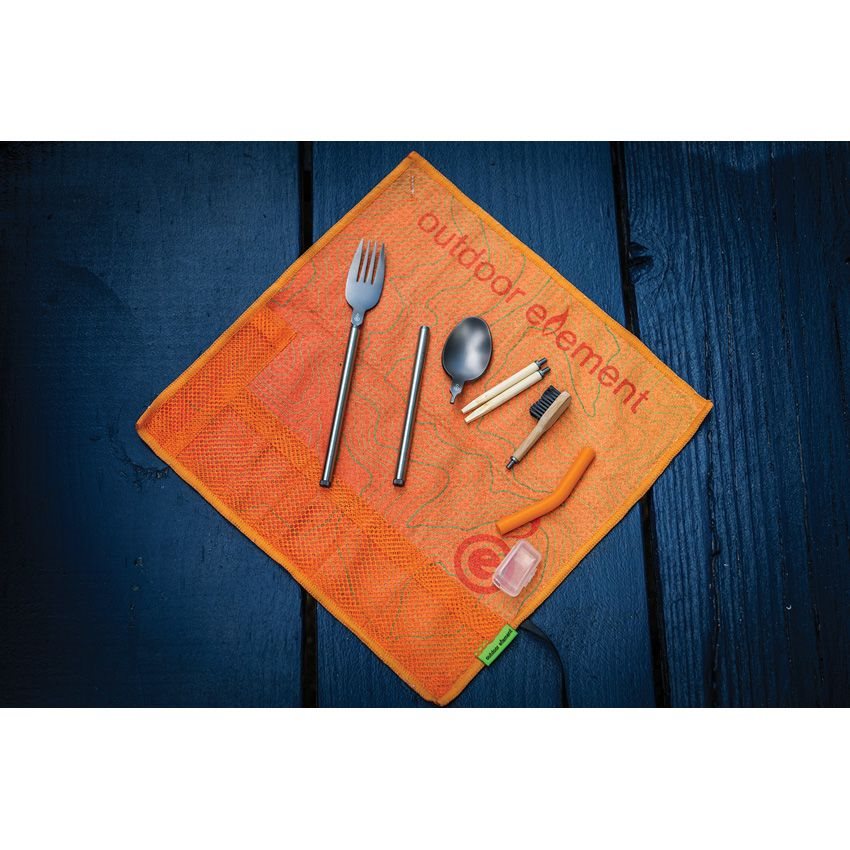 Pratico set di posate da esterno in combinazione con uno spazzolino da denti, il tutto confezionato in una custodia da viaggio arrotolabile che può essere appesa ovunque grazie al passante. La custodia può essere utilizzata come strofinaccio.