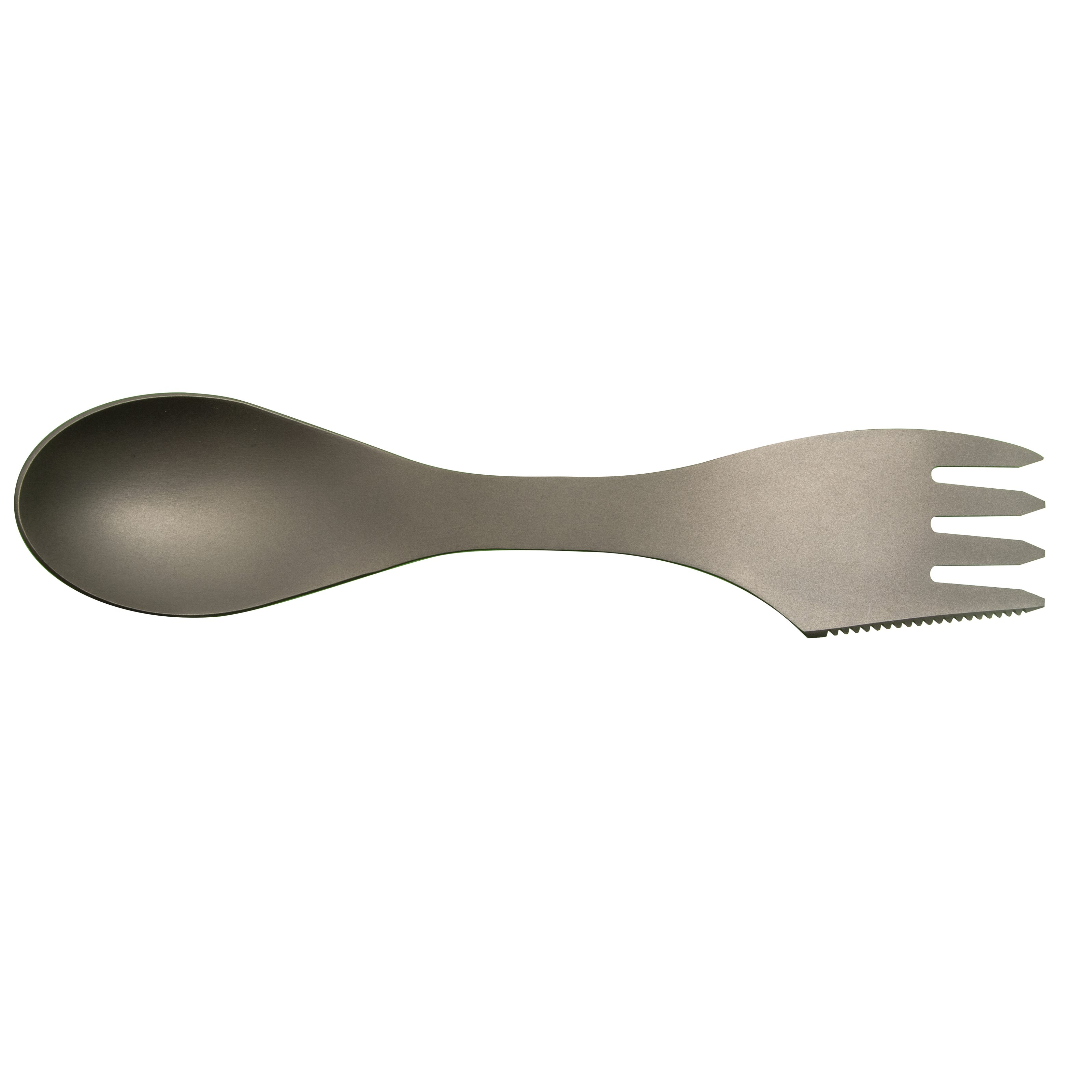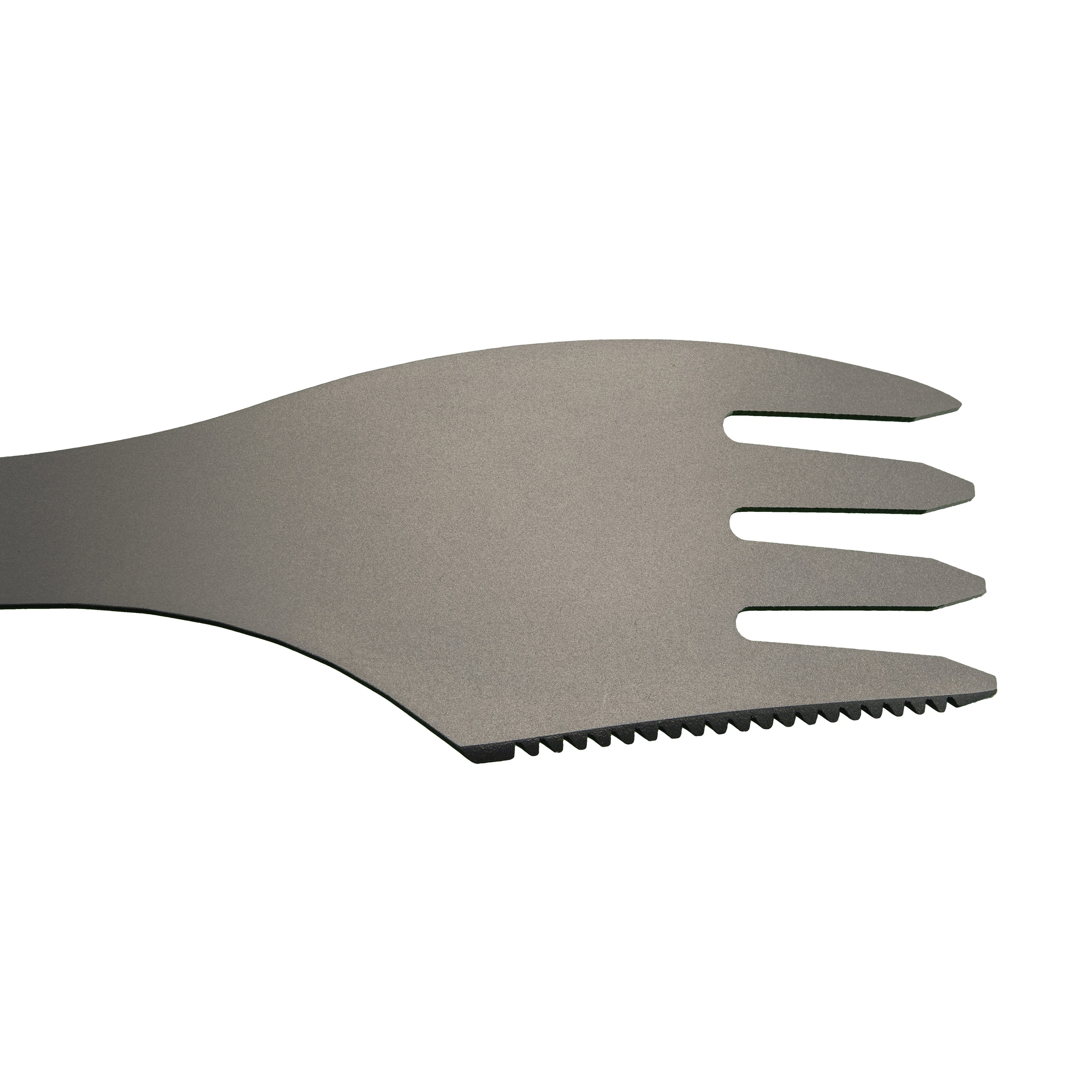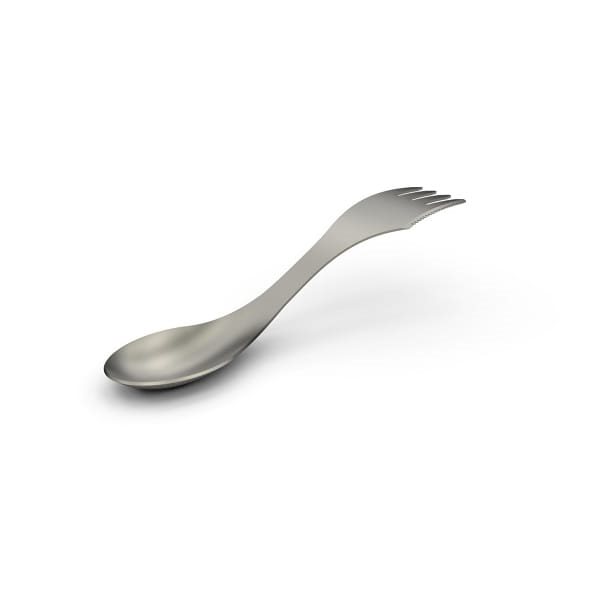 Posate leggere in titanio - forchetta, cucchiaio e coltello in un unico prodotto. Forma ergonomica. Peso: 25 g. Ulteriori informazioni