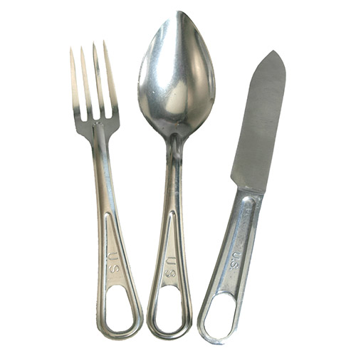 Riproduzione fedele del set di posate in tre pezzi utilizzato dall'esercito americano durante la seconda guerra mondiale. Il set comprende un cucchiaio da minestra grande, una forchetta e un coltello.