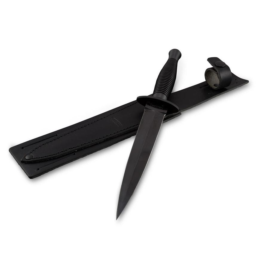 La lama del pugnale è realizzata in acciaio al carbonio di alta qualità tipo GR 1070 (12 071) con durezza 55 - 58 HRc e presenta una levigatura a cuneo, brunita. L'impugnatura del pugnale COMMANDOS è in metallo con scanalature e terminata con una guardia che impedisce alla mano di scivolare. Il pugnale 399-OK-1 COMMANDOS viene fornito in un fodero in pelle nera.