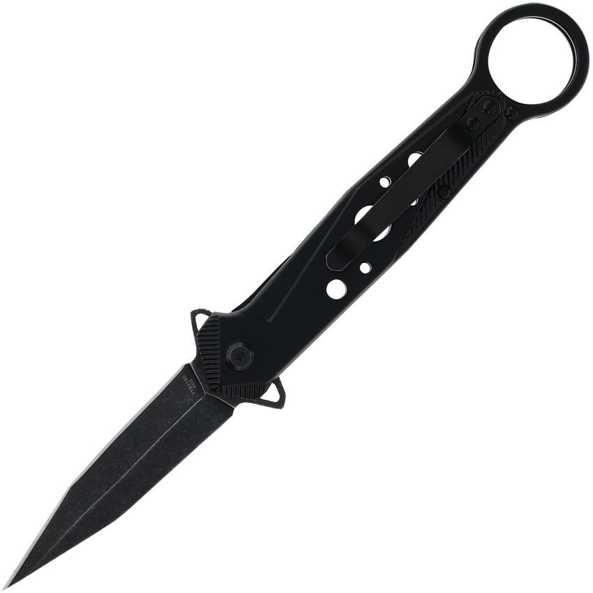 Elegante coltello a serramanico con lama dalla superficie annerita. La lama liscia presenta una affilatura su entrambi i lati e un sistema di apertura assistita che consente di aprire rapidamente il coltello con una sola mano. Quando è aperto, il coltello è bloccato da un affidabile fermo LinerLock. Il manico ha una forma confortevole e all'estremità è presente un anello ergonomico che migliora la presa. Naturalmente è presente anche una clip metallica per appendere il coltello.