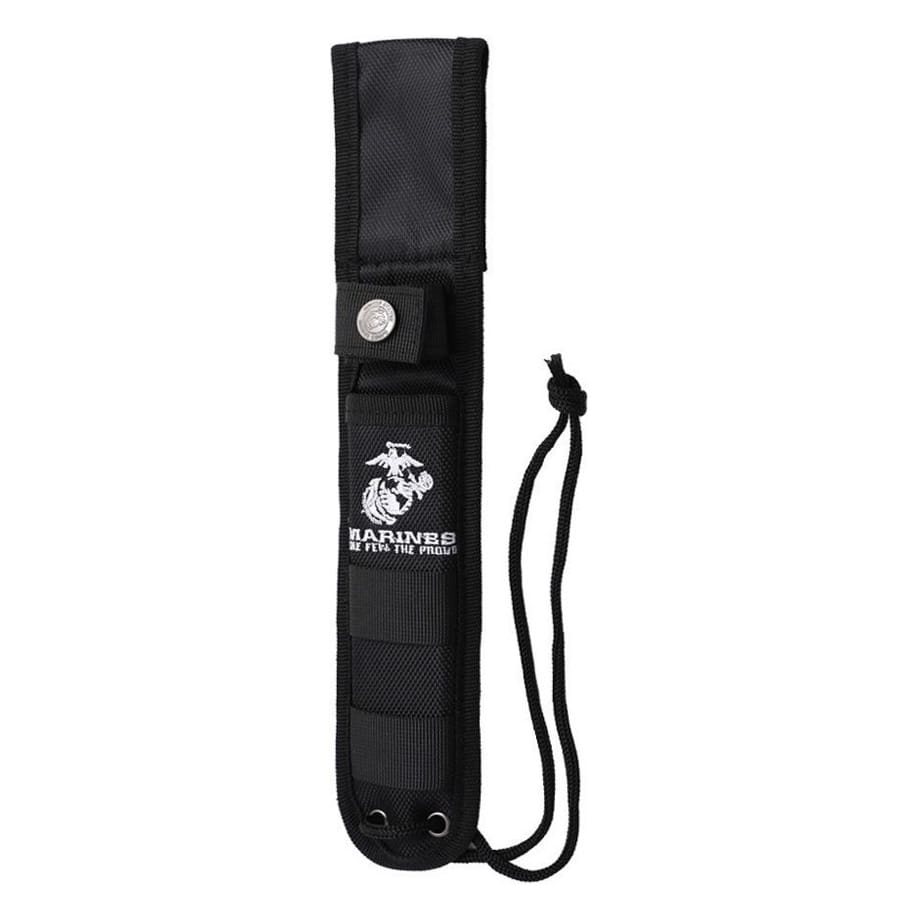 Pugnale full tang con marchio USMC concesso in licenza. La lama con doppio taglio è realizzata in acciaio inossidabile 3Cr13MoV, la sua superficie è rivestita da uno strato protettivo nero e dal logo MARINES THE FEW, THE PROUD. L'impugnatura è anatomica e le guancette sono realizzate in alluminio leggero. La parte inferiore dell'impugnatura è dotata di un rompivetro. Il coltello è fornito con un fodero in nylon da cintura, in cui il coltello è fissato con cinturini con chiusura a scatto.