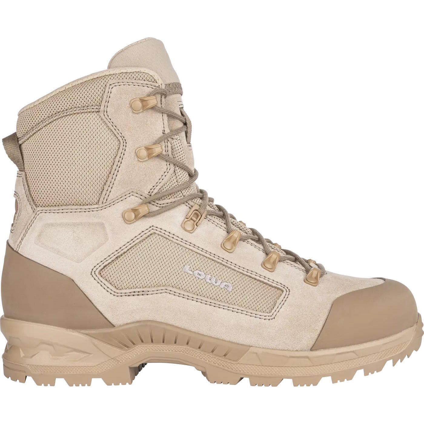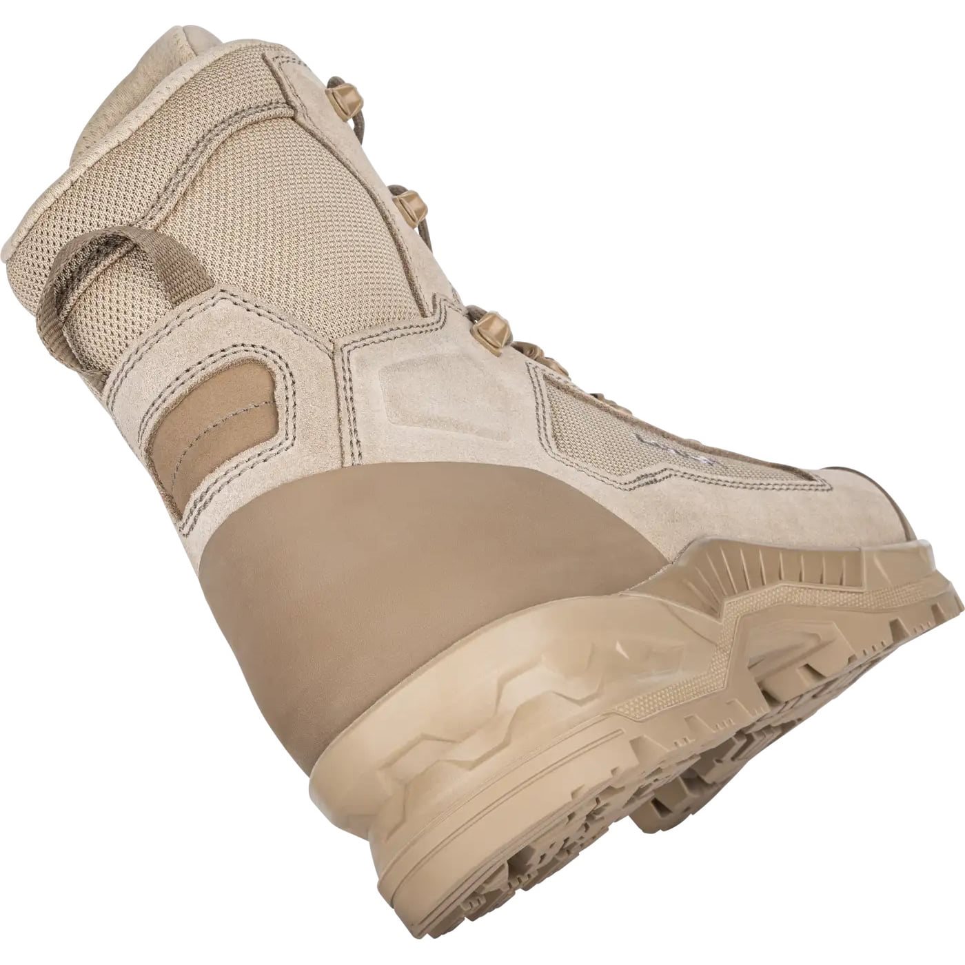 La tomaia della scarpa è composta per circa il 65% da morbida pelle scamosciata, mentre il restante 35% è in Cordura® Nylon resistente all'abrasione e traspirante. Le caviglie delle scarpe sono dotate di Poron, un materiale rivoluzionario che assorbe perfettamente urti, vibrazioni e scosse. L'intersuola della scarpa è in poliuretano ad alta densità, mentre l'arco plantare è dotato di supporto integrato. L'allacciatura della scarpa è a due zone e può essere regolata separatamente nella parte anteriore e orizzontale della scarpa.