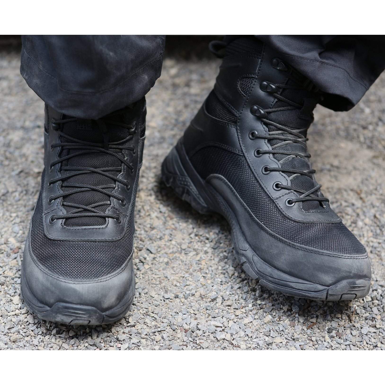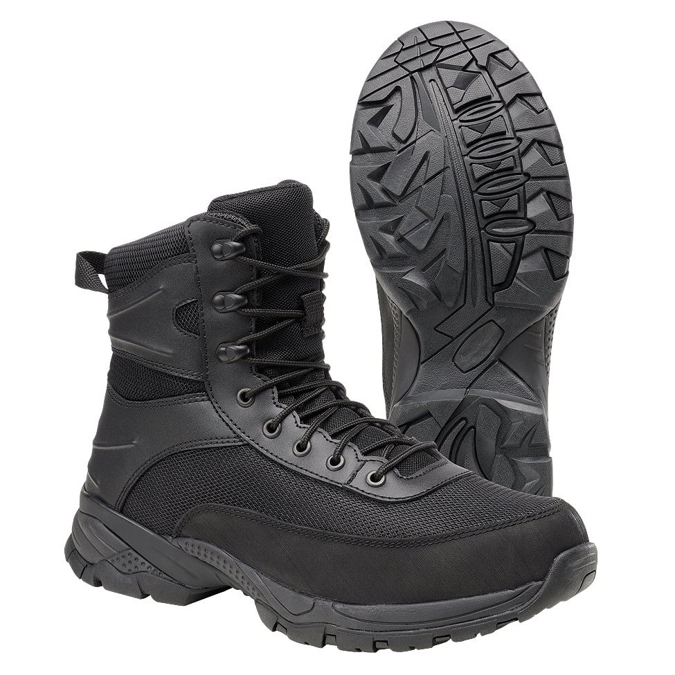 Scarpe tattiche leggere adatte sia per uso professionale che civile. La struttura della scarpa è rinforzata, mentre la tomaia è realizzata in pelle combinata con nylon traspirante. La linguetta della scarpa è piacevolmente imbottita e nella parte inferiore è saldamente fissata alla scarpa per evitare l'ingresso indesiderato di acqua e sporco. La caviglia della scarpa è massicciamente imbottita con schiuma EVA. La suola in nitrile è dotata di antiscivolo, è resistente agli oli e assorbe perfettamente gli urti e le vibrazioni.