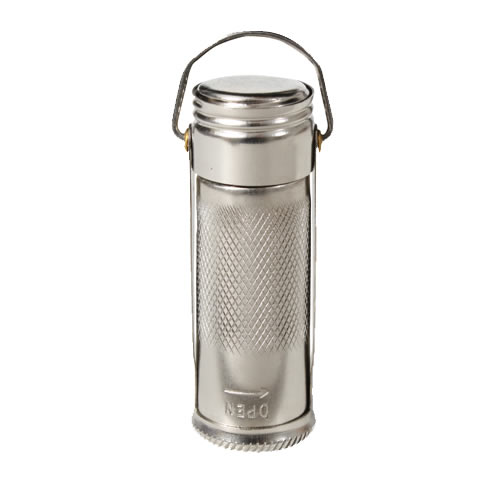 Scatola metallica per fiammiferi, coperchio con guarnizione impermeabile, anello per fissarla, ad esempio, alle chiavi. Altezza circa 6,3 cm. Fornita senza fiammiferi.