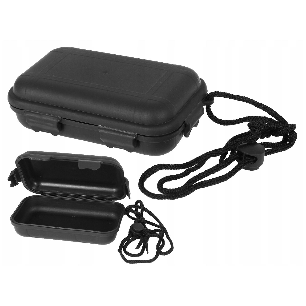 Scatola di plastica impermeabile nera con cordino.
