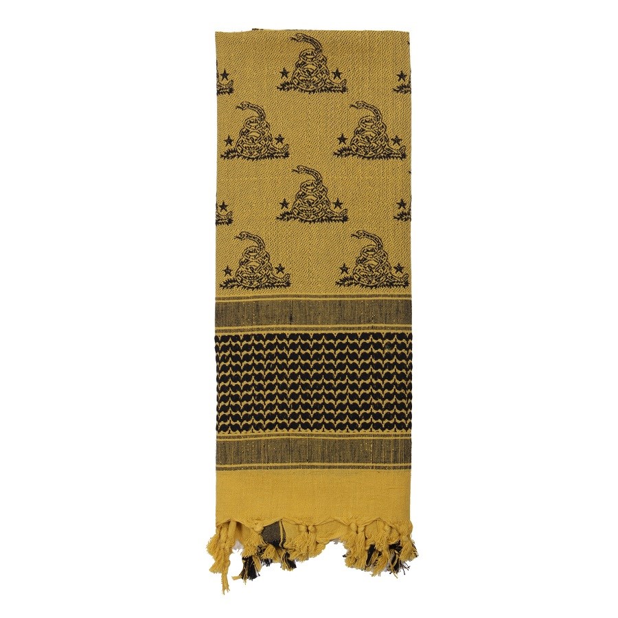 Sciarpa universale shemag, nota anche come palestina o arafat. Al centro della sciarpa è raffigurato il motivo "Gadsden", nome della bandiera storica utilizzata principalmente negli Stati Uniti con l'immagine di un serpente a sonagli. Dimensioni circa 107x107 cm, materiale: 100% cotone.