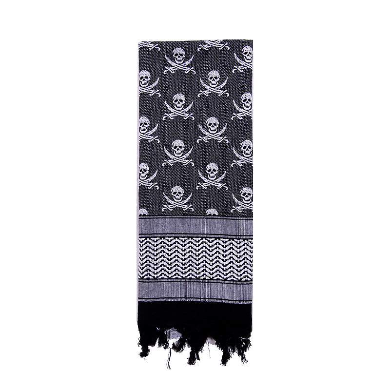 Shemag con motivo a teschi e ossa incrociate. Dimensioni: 107 x 107 cm. Materiale: 100% cotone.