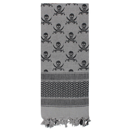 Shemag con motivo a teschi e ossa incrociate. Dimensioni: 107 x 107 cm. Materiale: 100% cotone.