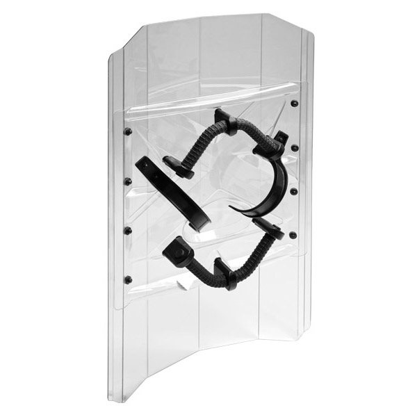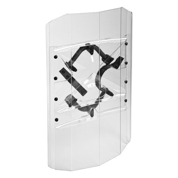 Dimensioni: larghezza 570 x altezza 1000 mm nella versione base, peso 4,25 kg. La larghezza può essere regolata a 550 mm, l'altezza può essere regolata secondo necessità. Viene utilizzato policarbonato di alta qualità ed estremamente resistente con uno spessore di 3 mm (su richiesta può essere modificato fino a 5 mm). La piastra di rinforzo interna ergonomica smorza efficacemente gli urti e la trasmissione delle vibrazioni alla mano che impugna lo strumento. Le impugnature consentono la presa con la mano destra o sinistra e allo stesso tempo una presa ausiliaria con la mano libera rimanente. La forma a freccia dello scudo devia efficacemente i colpi lateralmente. Aggiungendo il prodotto al carrello, si conferma di avere più di 18 anni.