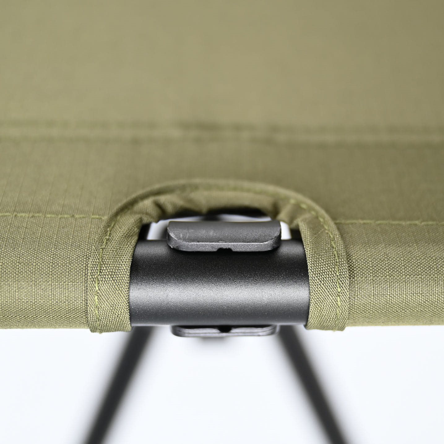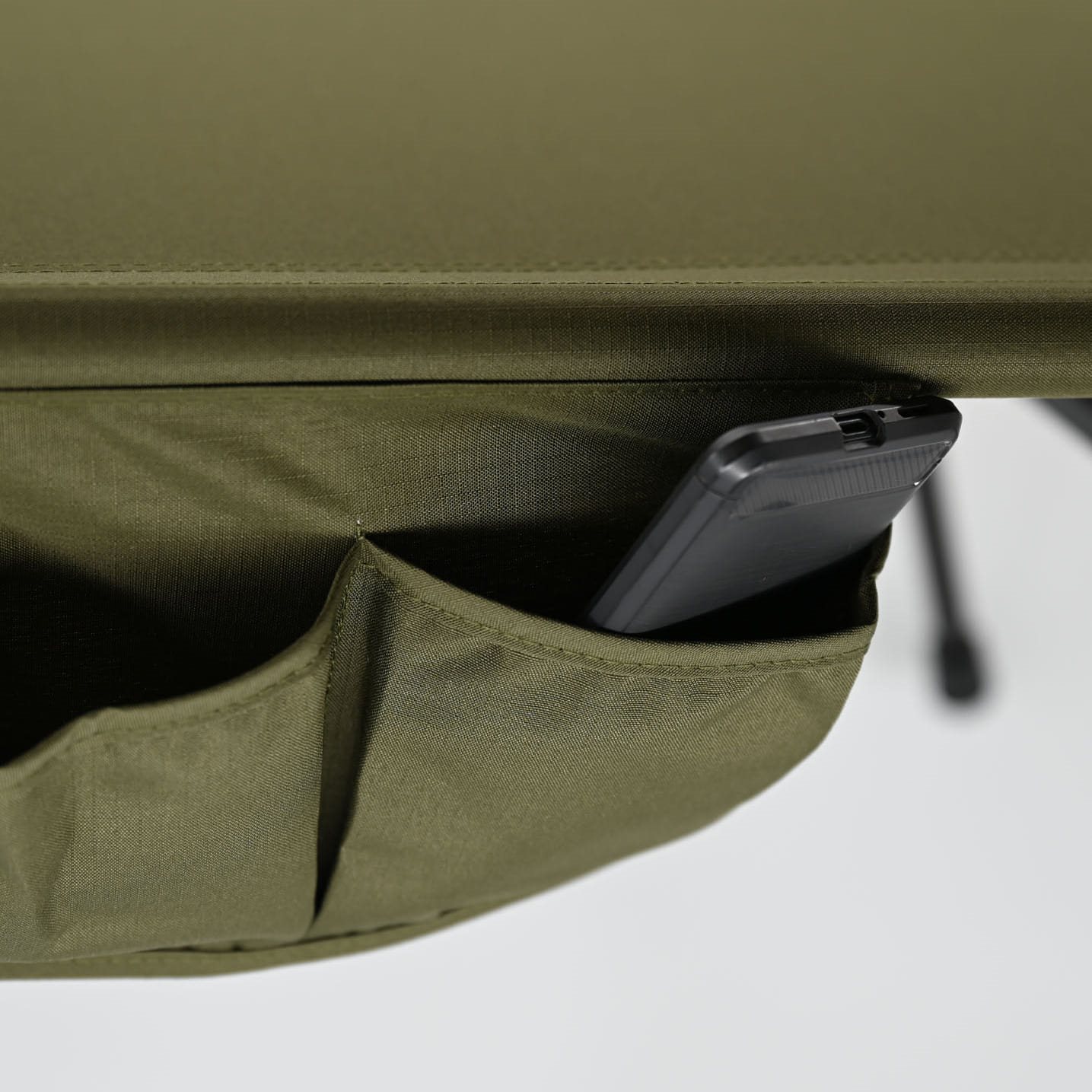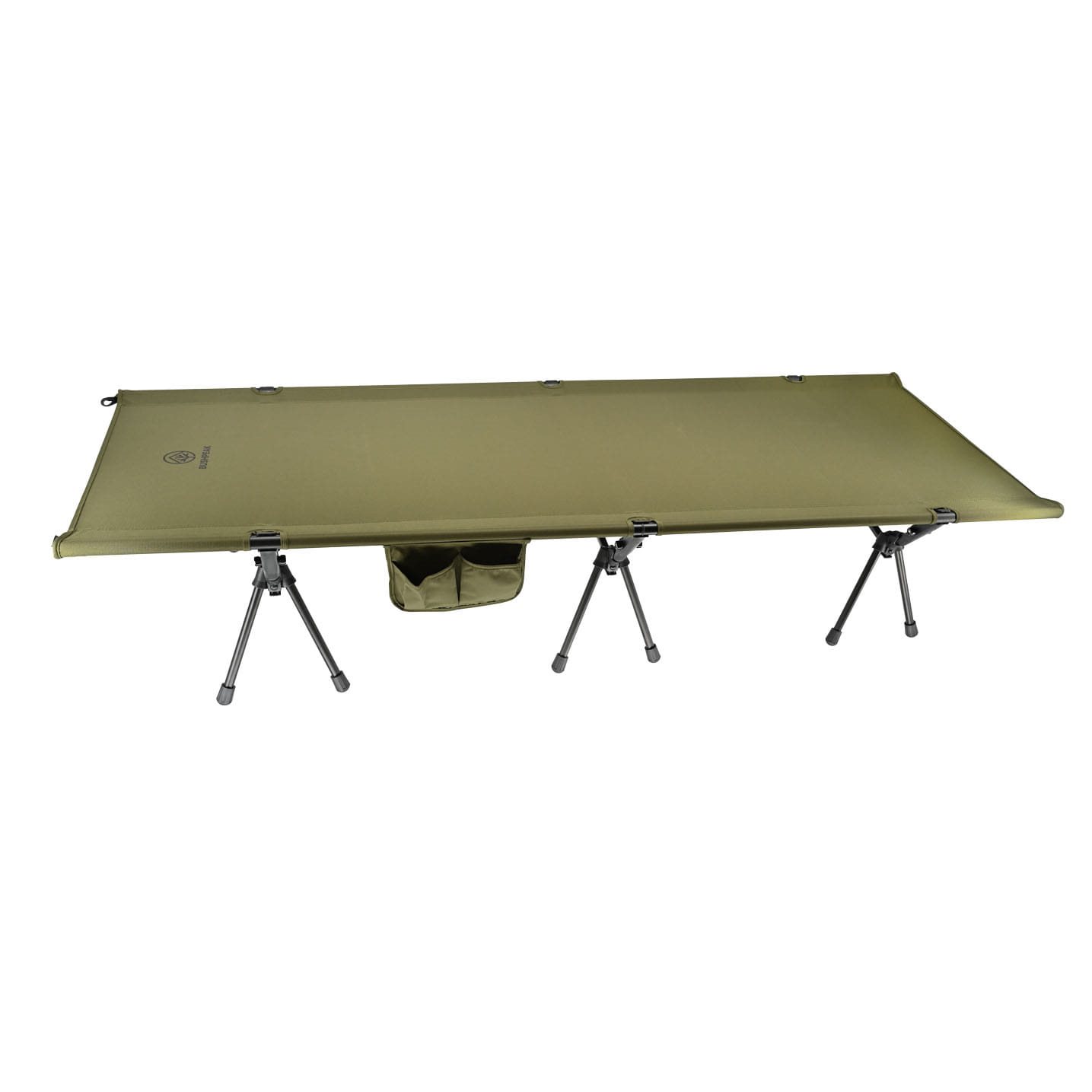 Letto da campeggio pieghevole leggero e compatto. La struttura inferiore può essere assemblata in pochi semplici passaggi. Le aste sono collegate da una corda di gomma, che ne facilita la corretta regolazione. Il piano di riposo si estende tramite una chiusura a scatto. Sul lato destro del letto è presente una tasca in cui è possibile riporre gli oggetti più importanti e averli a portata di mano anche in caso di emergenza.