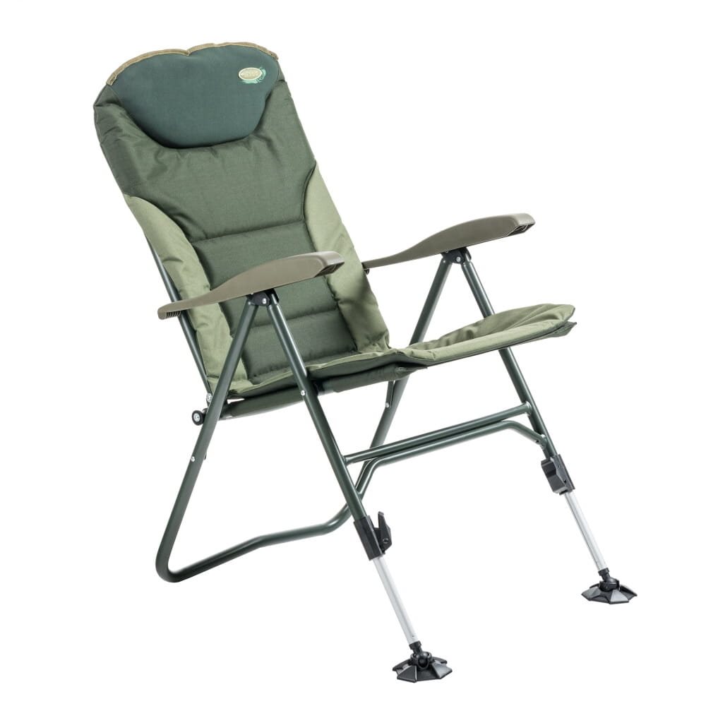 Poltrona di lusso con schienale anatomico e cuscino in neoprene imbottito in una nuova versione cromatica del materasso. Le gambe telescopiche anteriori sono dotate di ampi piedini oscillanti anti-affondamento. La struttura è molto stabile e resistente (portata 160 kg), ma allo stesso tempo molto leggera. La poltrona offre un sistema unico di inclinazione dello schienale quando si sollevano i braccioli.