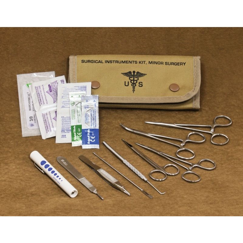 Set chirurgico US contenente 12 diversi strumenti medici e altri accessori. Il tutto è riposto in una custodia in tela. Materiale dei singoli strumenti: acciaio inossidabile. Ulteriori informazioni