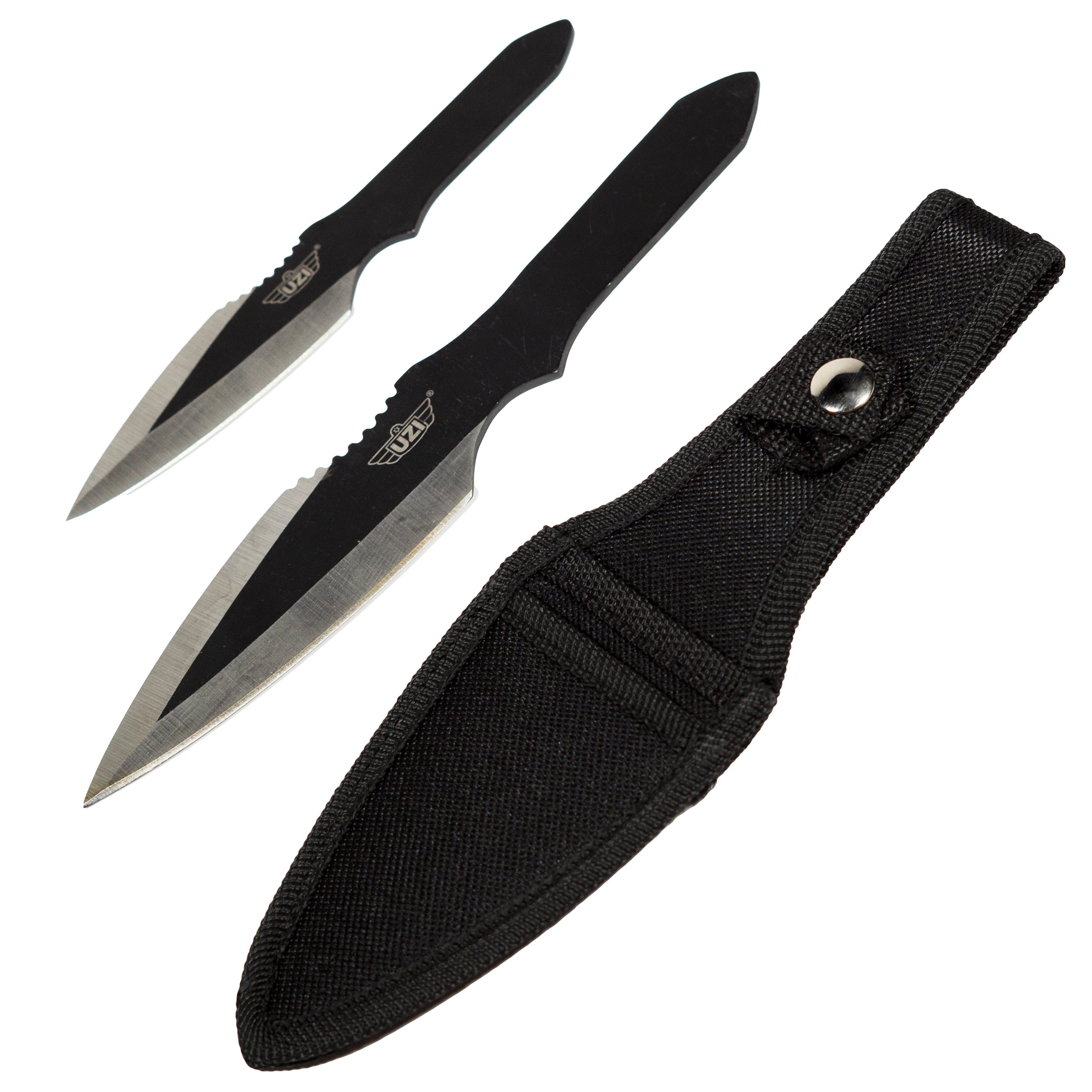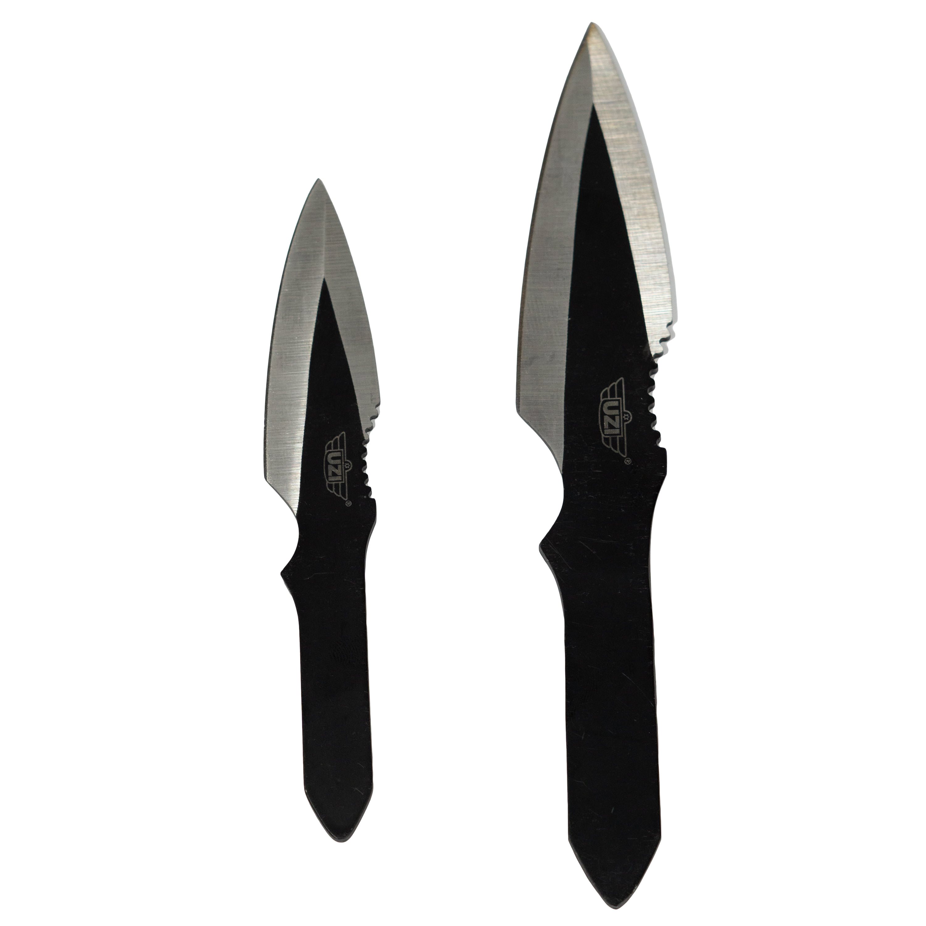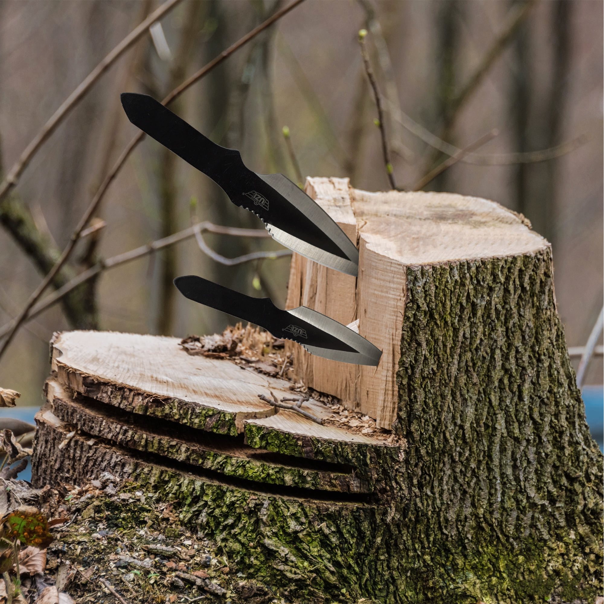 Set di due coltelli da lancio di diverse dimensioni con lama liscia. I coltelli sono realizzati in acciaio inossidabile di alta qualità con parziale annerimento. Il coltello più grande misura circa 20,3 cm di lunghezza e pesa 88 g, mentre quello più piccolo misura circa 15,2 cm e pesa 37 g. I coltelli sono forniti con una custodia in nylon nero.