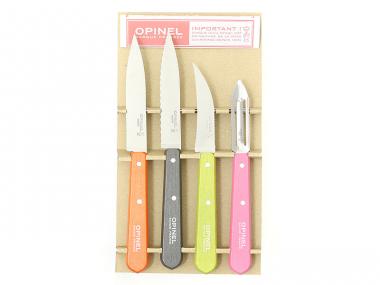 La confezione comprende 4 coltelli da cucina essenziali: un coltello da cucina, un coltello Cranté, un coltello da verdura e un pelapatate. I manici dei coltelli sono colorati e verniciati. Il coltello da cucina e il coltello seghettato sono prodotti in Francia. Il coltello da verdura e il pelapatate sono prodotti in Portogallo.