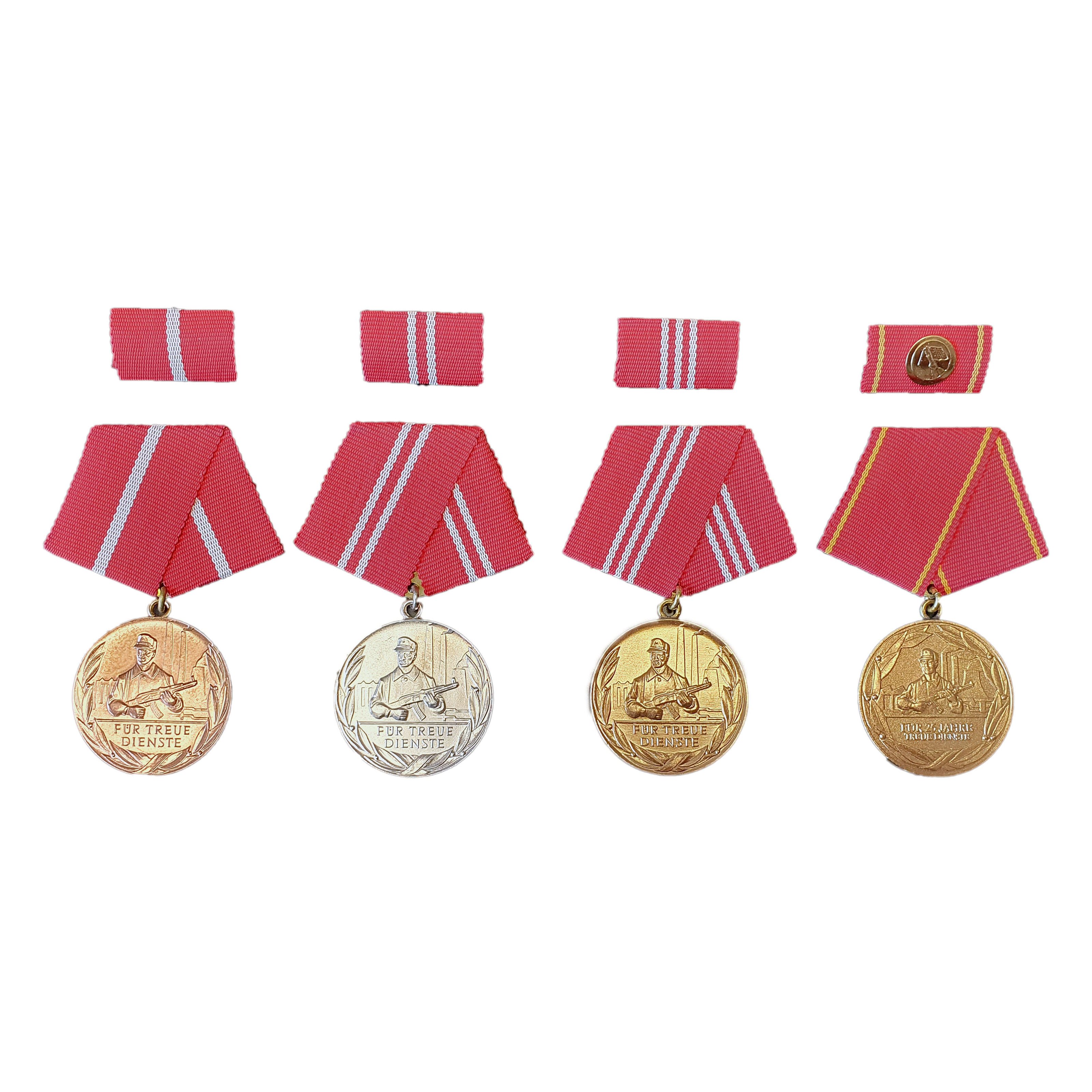 Medaglie conferite per fedele servizio nei gruppi di combattimento della classe operaia della Repubblica Democratica Tedesca. Fornite nella confezione originale. 4 pezzi nel set.