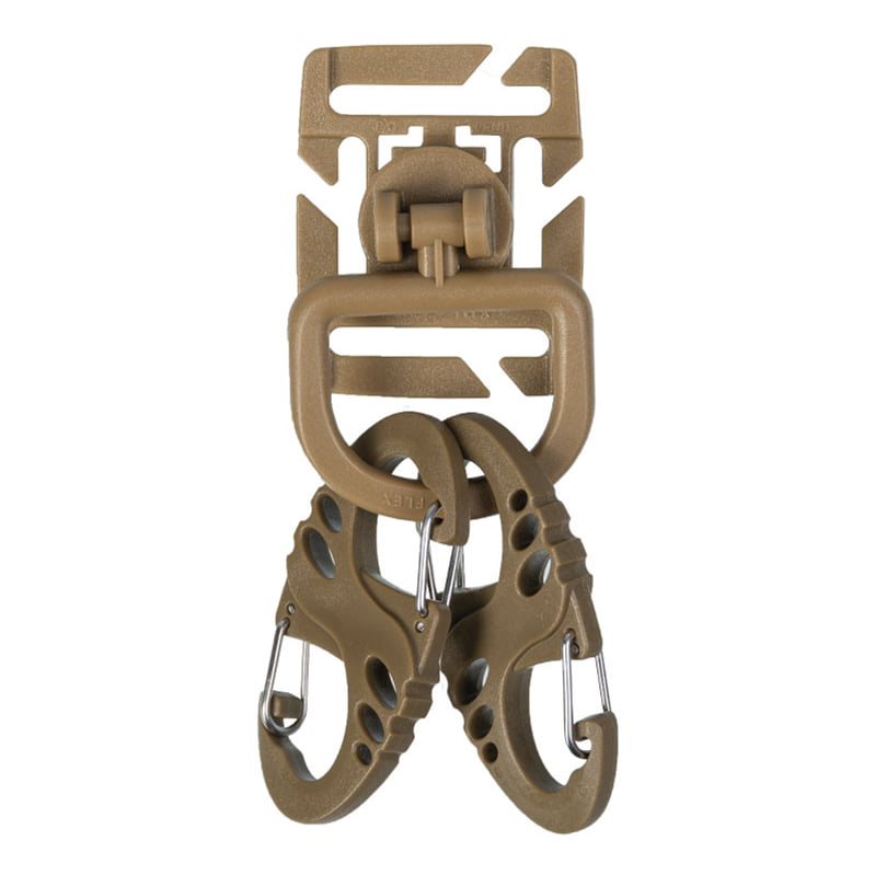 Pratico set tattico composto da una coppia di moschettoni a S e un sistema di fissaggio Duraflex. Questo sistema di fissaggio è costituito da una piattaforma e da un anello a D sganciabile. È pienamente compatibile con il sistema di aggancio modulare standard MOLLE/PALS e l'anello è girevole a 360°.