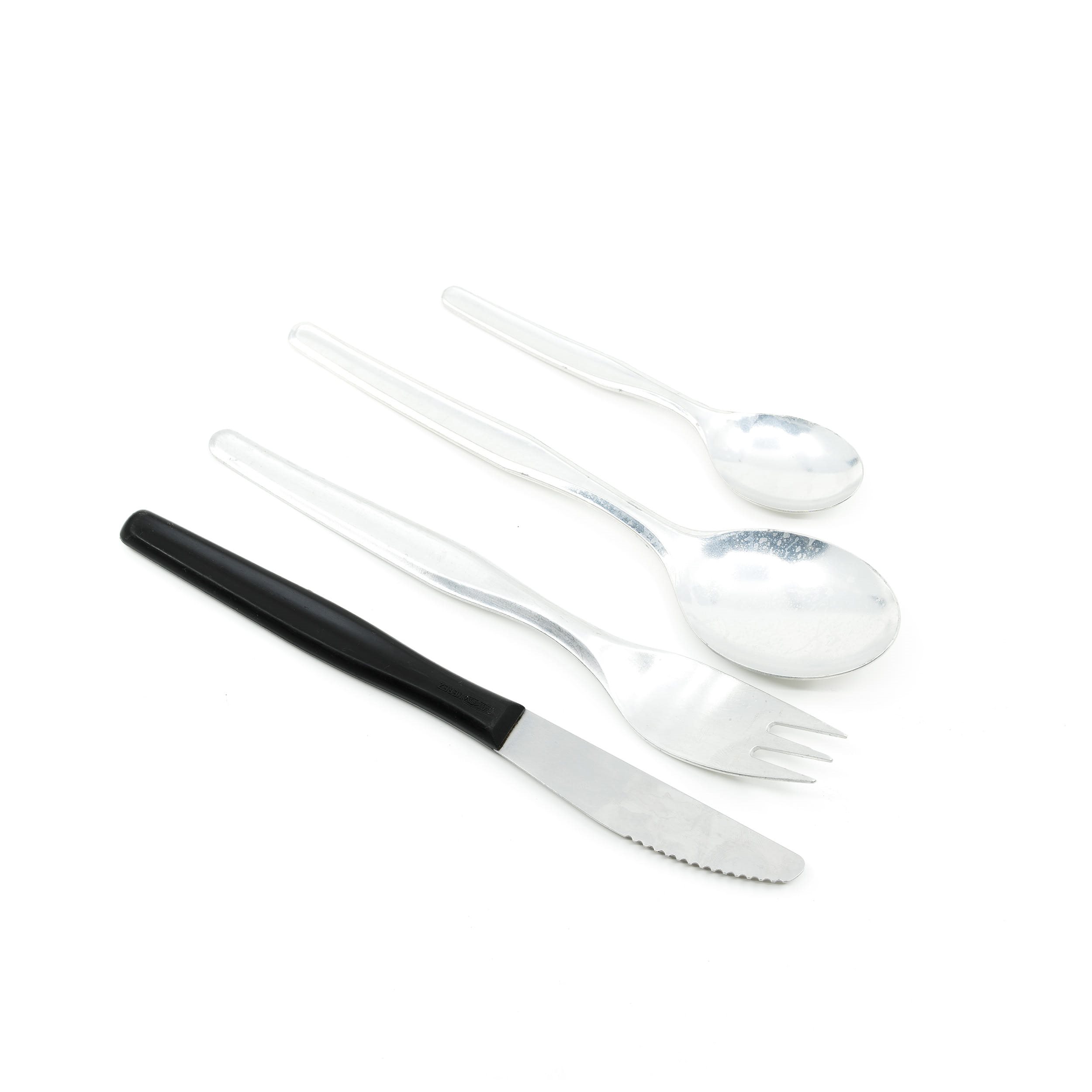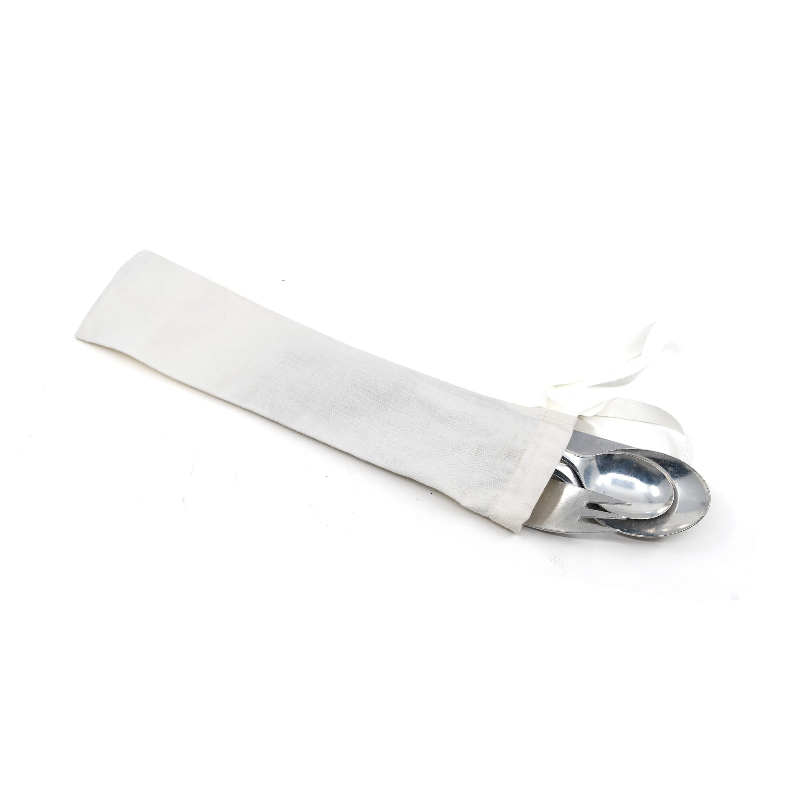 Set di posate - coltello, forchetta, cucchiaio da minestra, cucchiaino da tè. Conservato in una confezione bianca in tela. Materiale: alluminio.