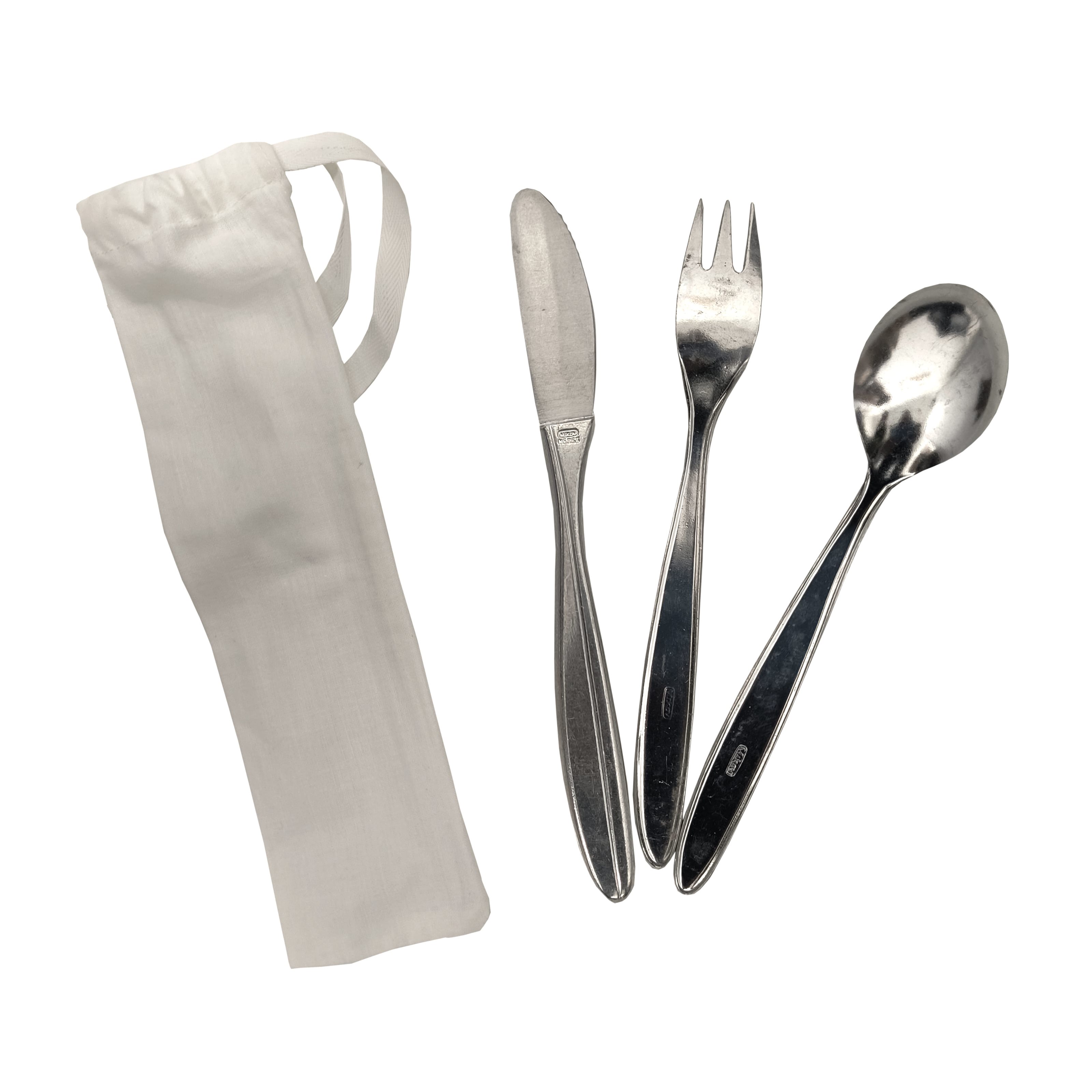 Set di posate - forchetta, coltello, cucchiaio da minestra. La confezione include una custodia in tela bianca. Prodotto conservato a lungo = può presentare segni esterni di usura. Ulteriori informazioni