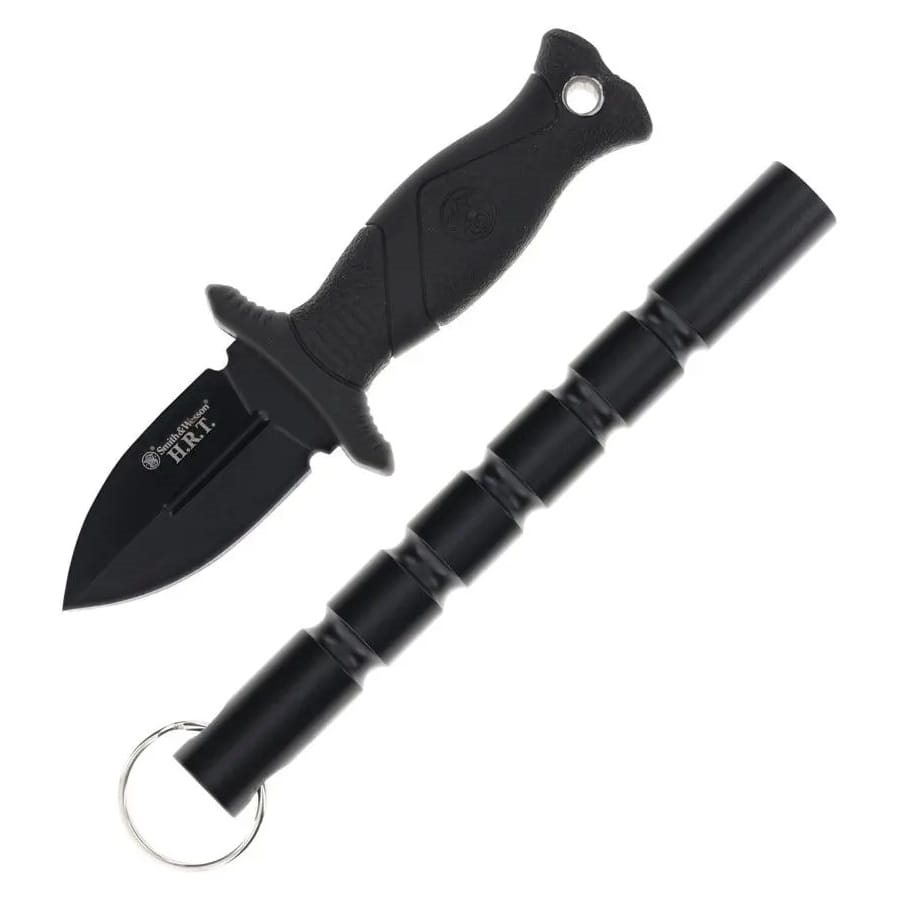Set composto da coltello compatto e kubotan in alluminio. Il coltello, interamente nero, è realizzato in acciaio inossidabile, presenta una lama liscia e il manico è realizzato in polimero con impugnatura antiscivolo. All'estremità del manico è presente un foro per il passaggio del cordino di sicurezza. Per una maggiore sicurezza durante l'uso, il coltello è dotato di una protezione. Il coltello è fornito con un fodero in plastica.