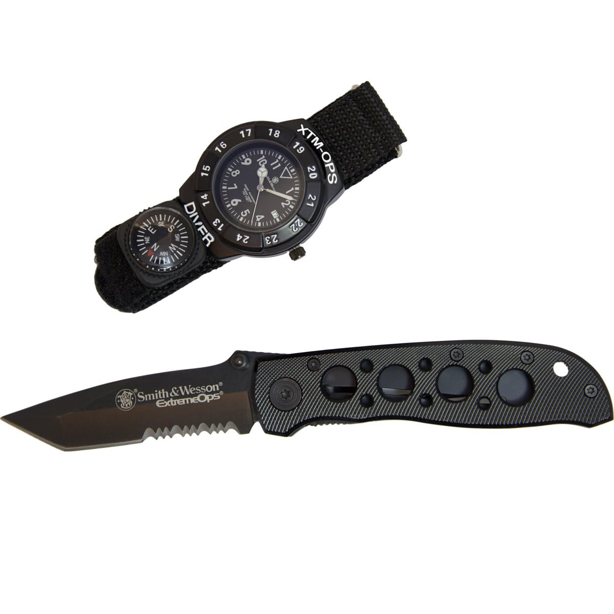 Set composto da coltello tattico con lama combinata e orologio con piccola bussola. L'intero set è confezionato in una scatola regalo in metallo.