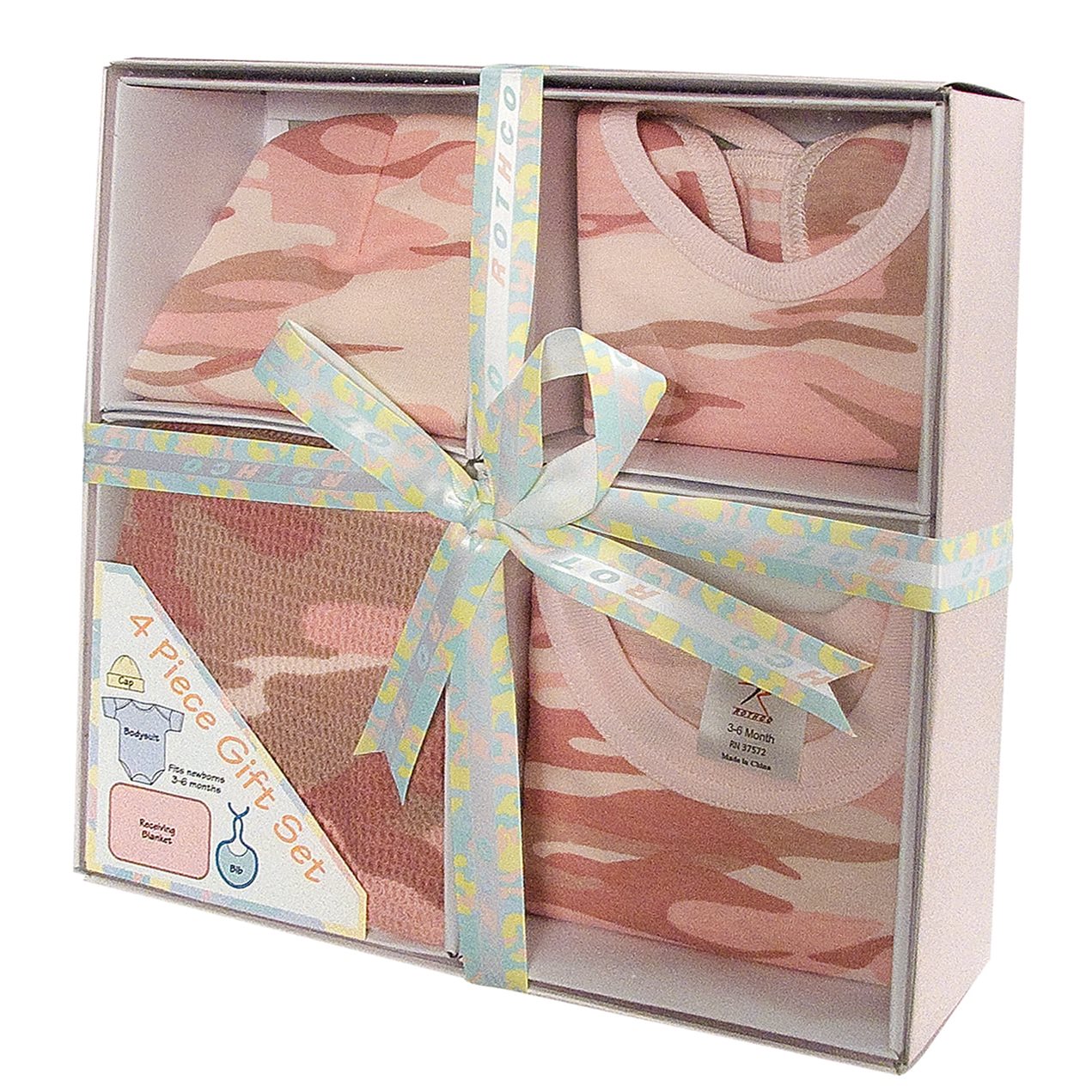 Set regalo per neonati con motivo mimetico Baby Pink. La confezione contiene: body (taglia 3-6 mesi), cuffietta, bavaglino e copertina (71 x 100 cm).