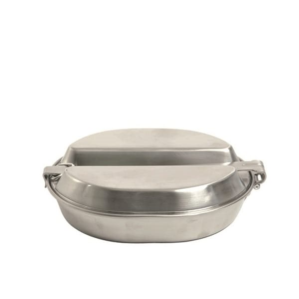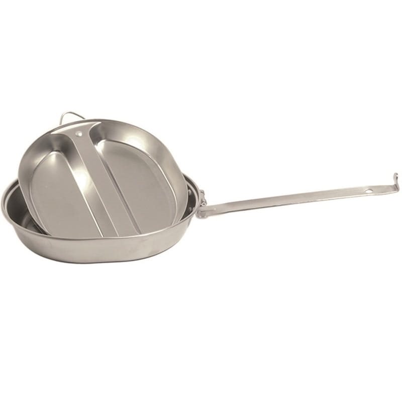 Nuovo set da tavola in acciaio inossidabile composto da due pezzi, realizzato secondo il modello dell'esercito americano. Il set comprende una padella e un piatto diviso in due metà.