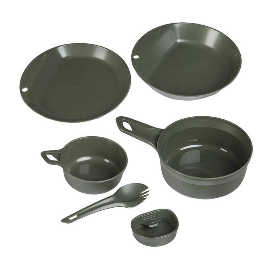 Pratico set da campeggio composto da sei pezzi: ciotola piccola e grande, due piatti, tazza e posate. Prodotto in Svezia.
