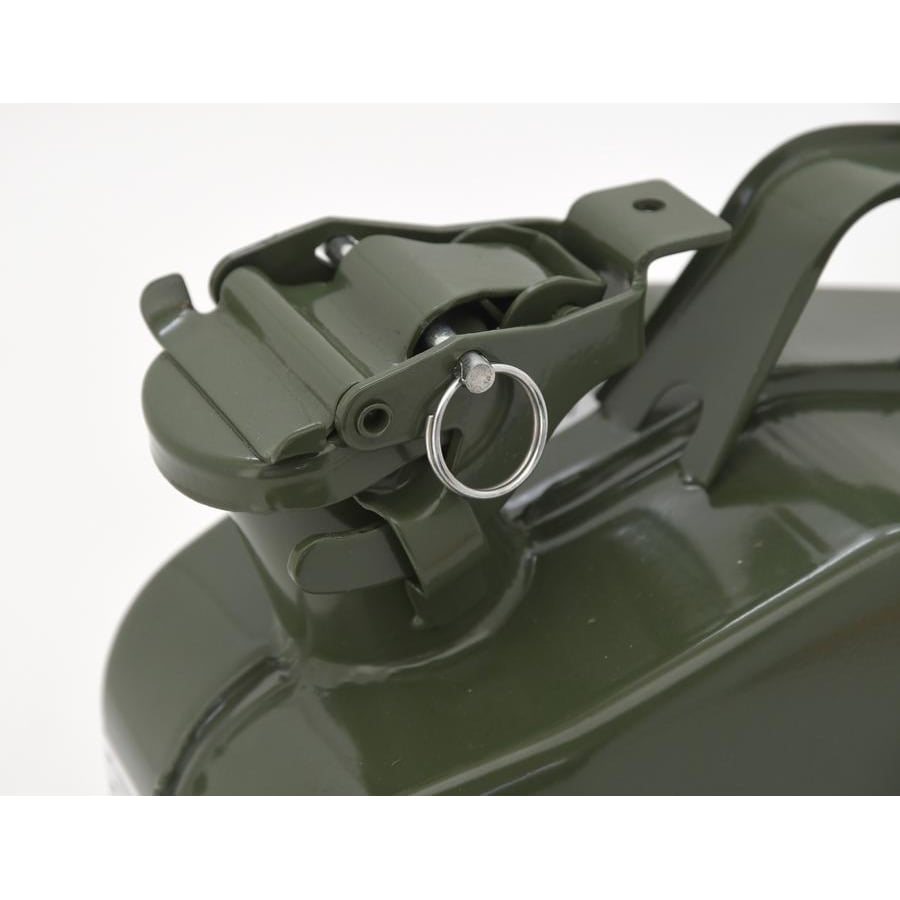 Tanica metallica per carburante con una capacità di 5 litri. Il collo della tanica è dotato di un meccanismo di chiusura con tappo, guarnizione e dispositivo di sicurezza contro l'apertura. I lati profilati del contenitore ne garantiscono la forma stabile, evitando così che le pareti si deformino a causa della pressione. Il contenitore è dotato di una pratica maniglia sulla parte superiore che ne facilita la manipolazione. La superficie del contenitore è tradizionalmente verniciata in verde oliva, in modo da proteggere il materiale dalla corrosione.