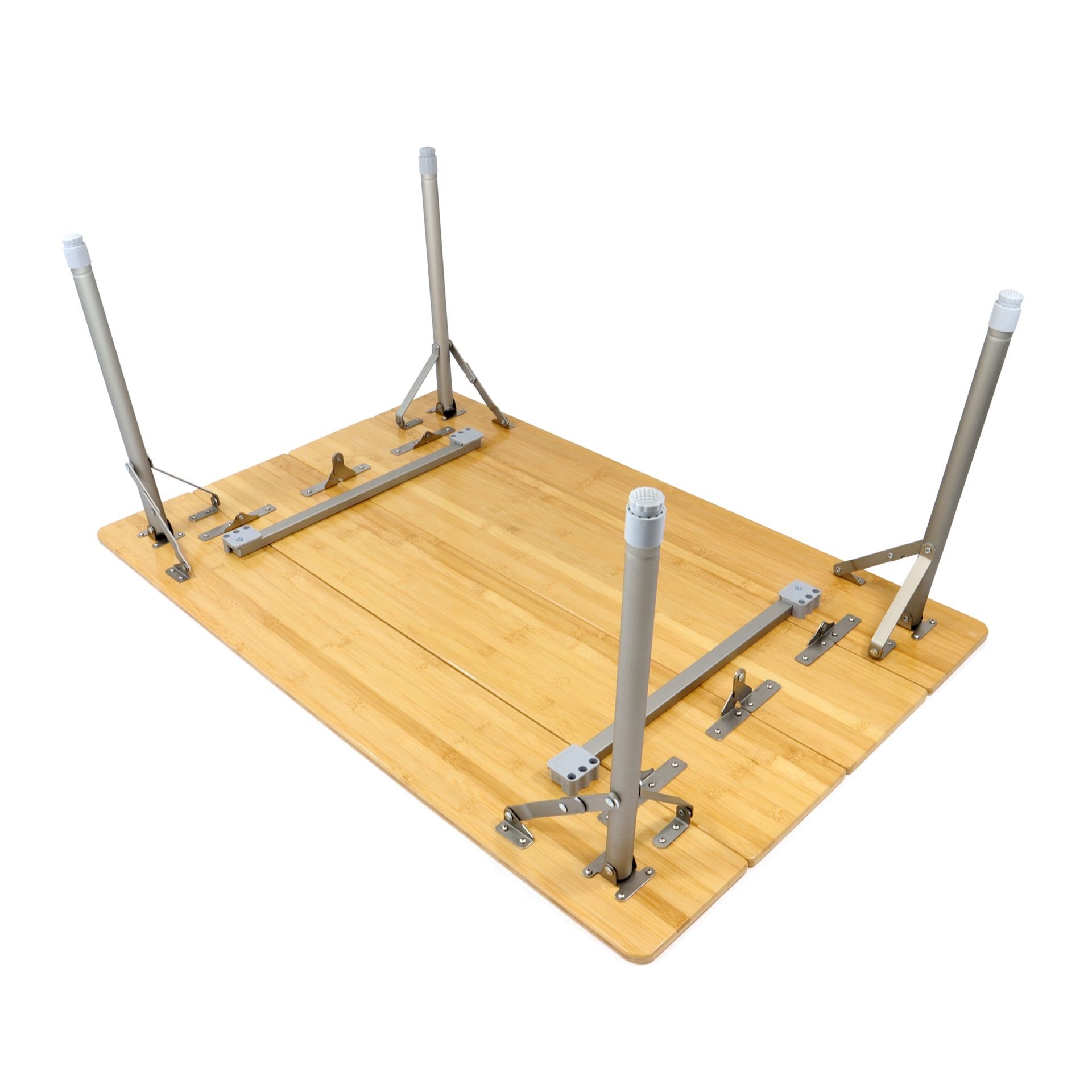 Elegante tavolo pieghevole in bambù con gambe regolabili in altezza per compensare le irregolarità del terreno. Ulteriori informazioni