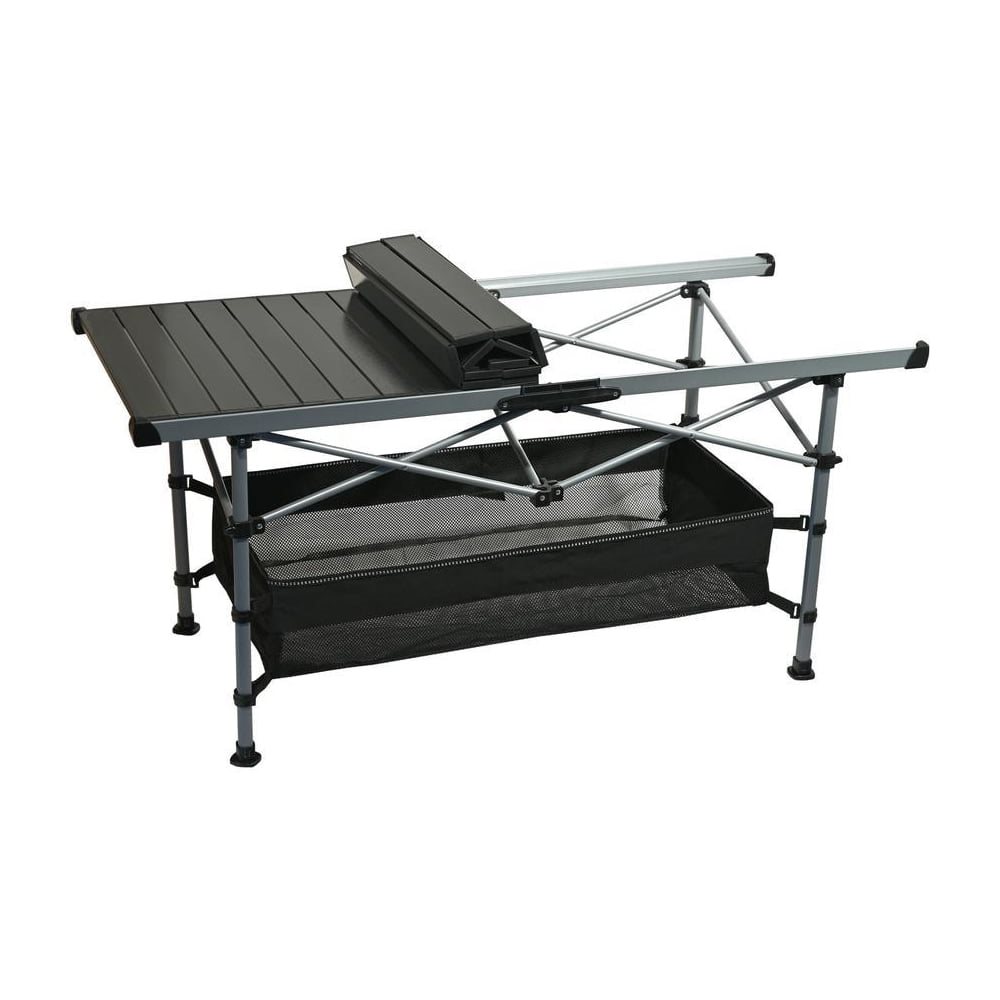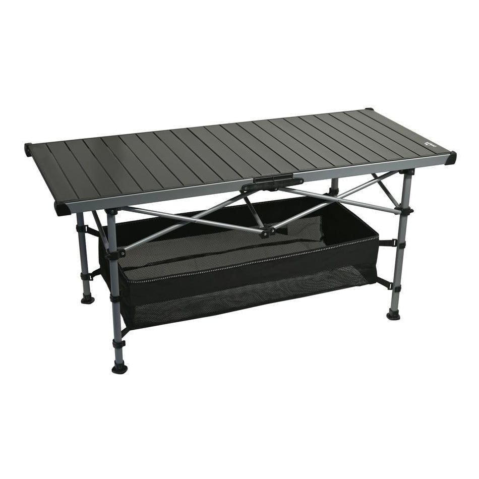 Il tavolo è dotato di un piano in alluminio a lamelle con dimensioni di 123 x 55 cm e un'altezza di 57 cm (* può essere rialzato fino a 5 cm su una superficie piana) e offre una portata massima fino a 100 kg di attrezzature, alimenti, ecc.