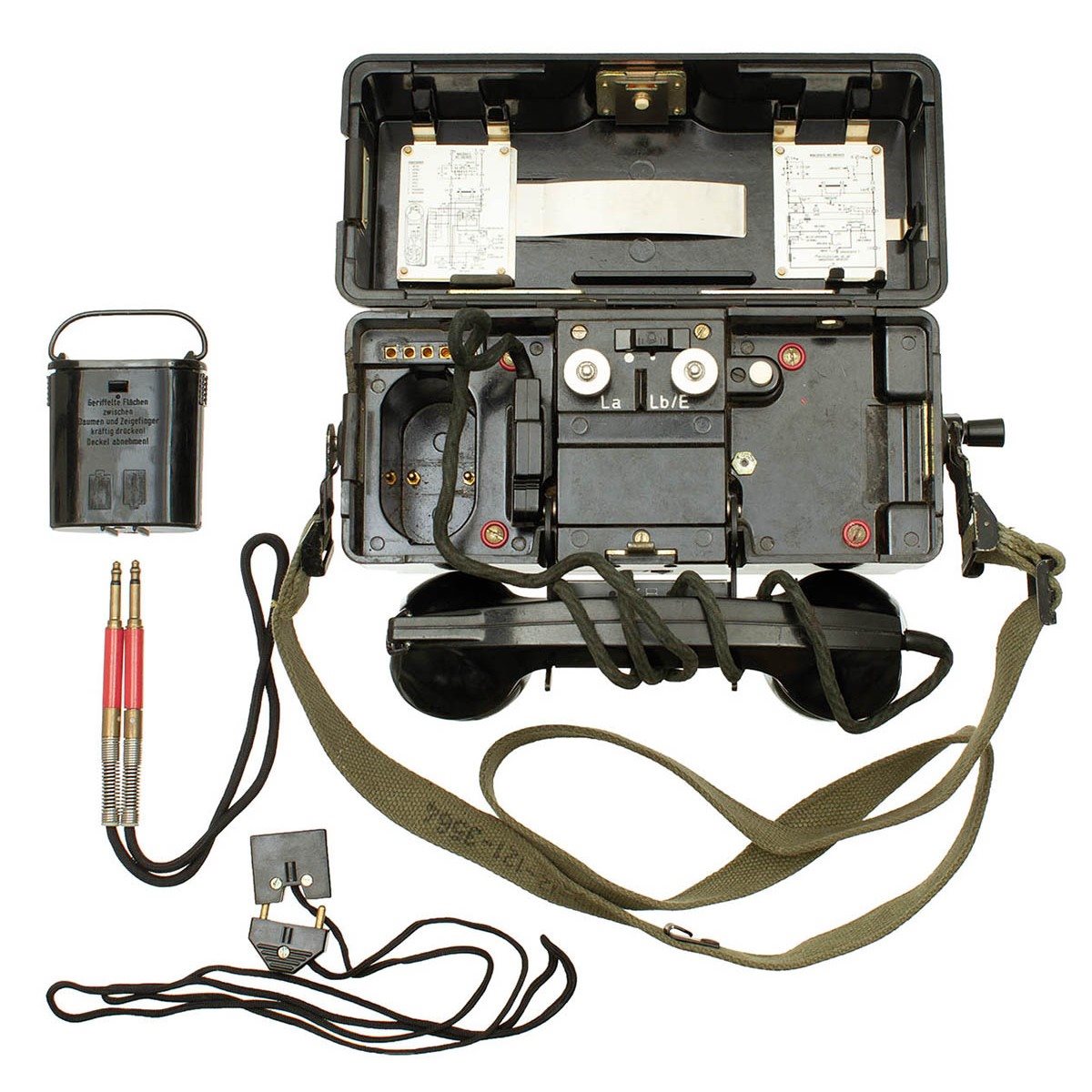 Telefono da campo utilizzato, proveniente dalle eccedenze dell'esercito tedesco, in ottime condizioni. Alimentazione a due batterie di tipo D (grande cilindro). Gancio esterno per la cornetta, pulsante morse. Peso 4,25 kg senza batterie. Dimensioni circa 25 x 17 x 11 cm.