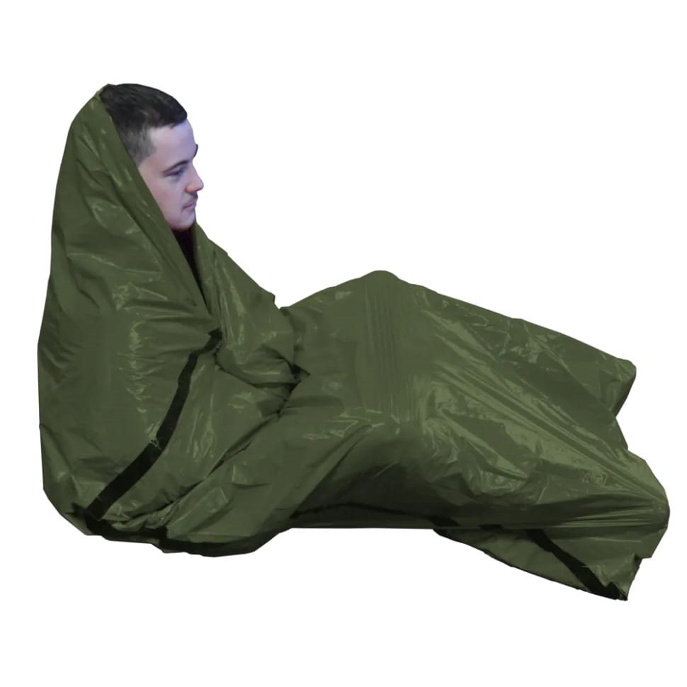Foglio termico di emergenza leggero, progettato per situazioni in cui si è sorpresi dal maltempo durante il viaggio. La pellicola è leggera, resistente al vento e all'acqua, realizzata in materiale antistrappo e rivestita internamente da un sottile strato di alluminio che riflette efficacemente il calore verso l'utente. Fornita con custodia da trasporto in poliestere di colore verde con chiusura a cordoncino con fermo in plastica.