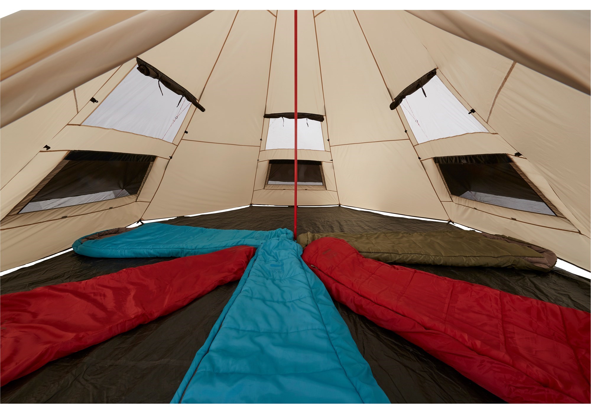 Grande tepee in tessuto poliestere con un'insolita asta centrale in acciaio, leggero, facilmente trasportabile, semplice da montare.