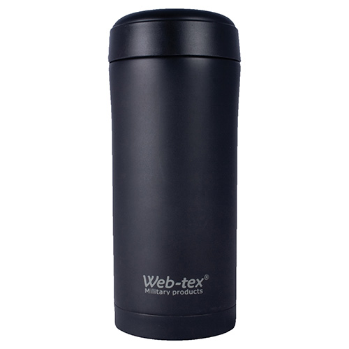 Piccolo thermos in acciaio inossidabile di colore nero, ideale per conservare bevande calde o fredde. Ampio tappo a vite con guarnizione in silicone.