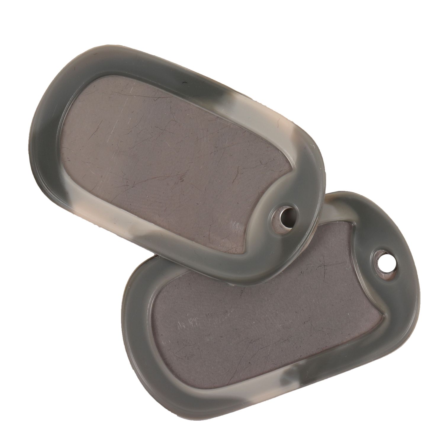 Tappi per medagliette identificative (note anche come medagliette per cani o Dog Tags), in mimetico fogliame (combinazione di colori grigio e bianco - ACU digital). Prodotto negli Stati Uniti, materiale: silicone resistente colorato. Confezione da 2 pezzi (1 paio).