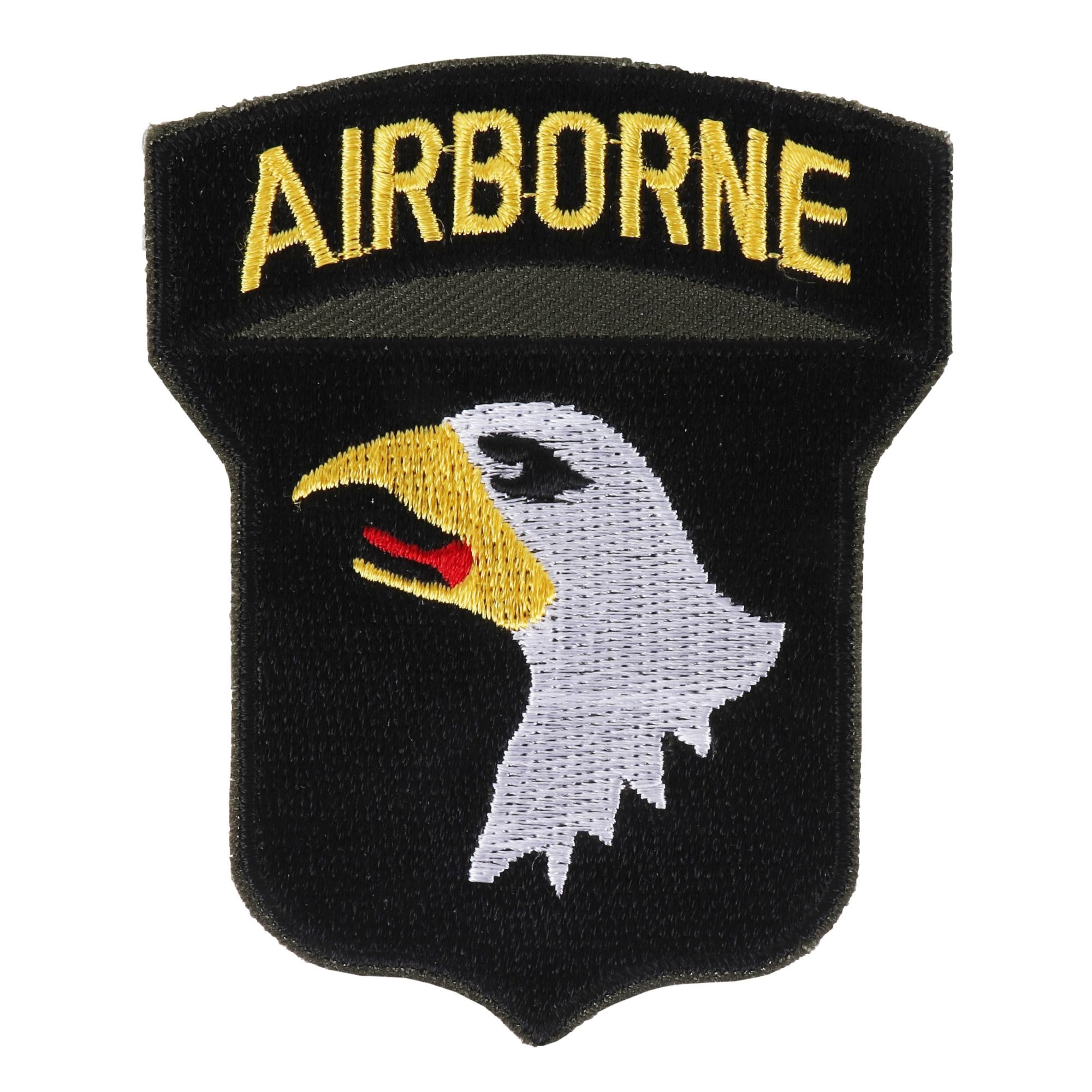 Toppa destinata ad essere cucita su tessuti - giacche, pantaloni, cappelli, borse, magliette... Raffigura l'insegna della 101ª Divisione aviotrasportata americana Airborne. Dimensioni della toppa: 85 x 70 mm. Materiale: cotone, poliestere. Ulteriori informazioni