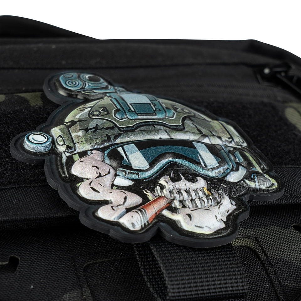 Patch 3D in plastica con chiusura in velcro raffigurante un teschio con sigaro acceso, occhiali tattici e casco.