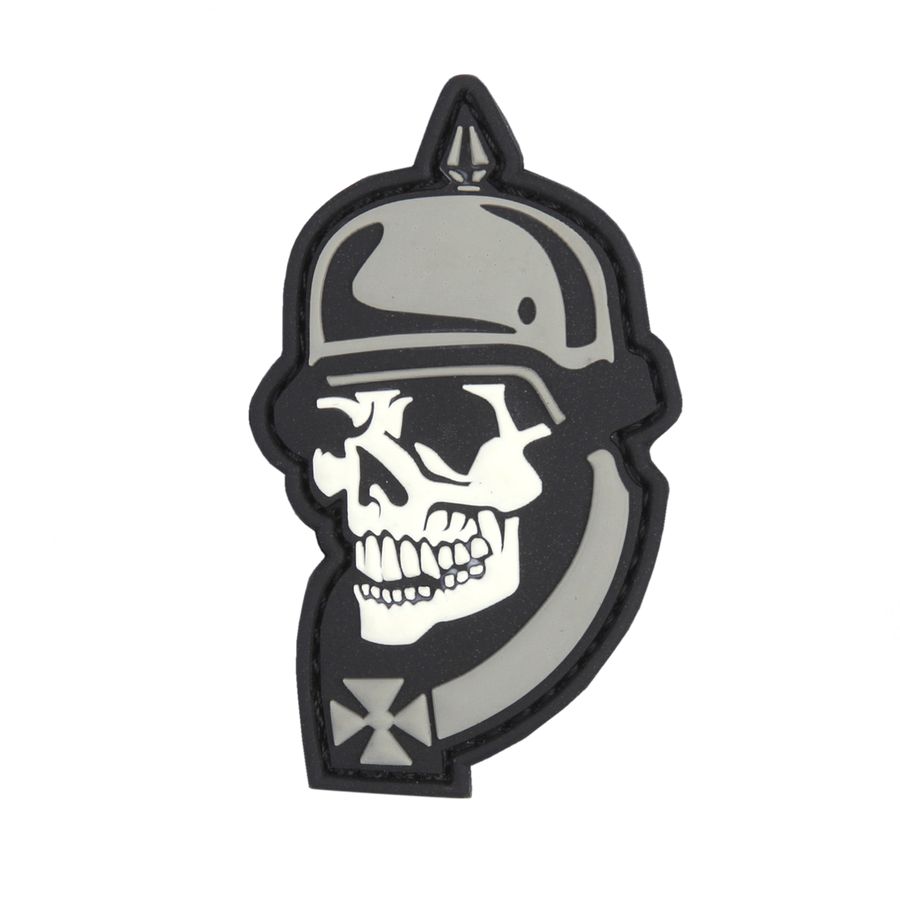 Toppa 3D in plastica con chiusura in velcro raffigurante un teschio all'interno di un elmetto tedesco della prima guerra mondiale e una croce. Dimensioni: circa 6,5 x 3,8 cm.