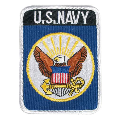Toppa in tessuto con scritta e stemma US NAVY. Dimensioni circa 7,5 x 10 cm.