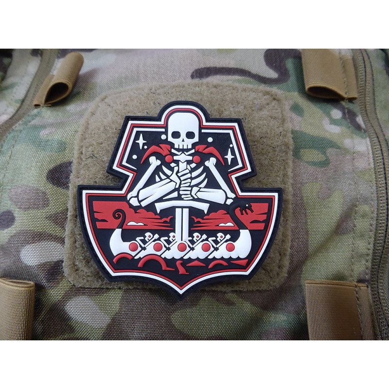 Patch sul retro con velcro per il fissaggio su qualsiasi attrezzatura o equipaggiamento dotato di pannello in velcro. Nella parte inferiore è raffigurata una nave vichinga con scheletri che remano, sopra di essi uno scheletro con una spada. Fissaggio con velcro.