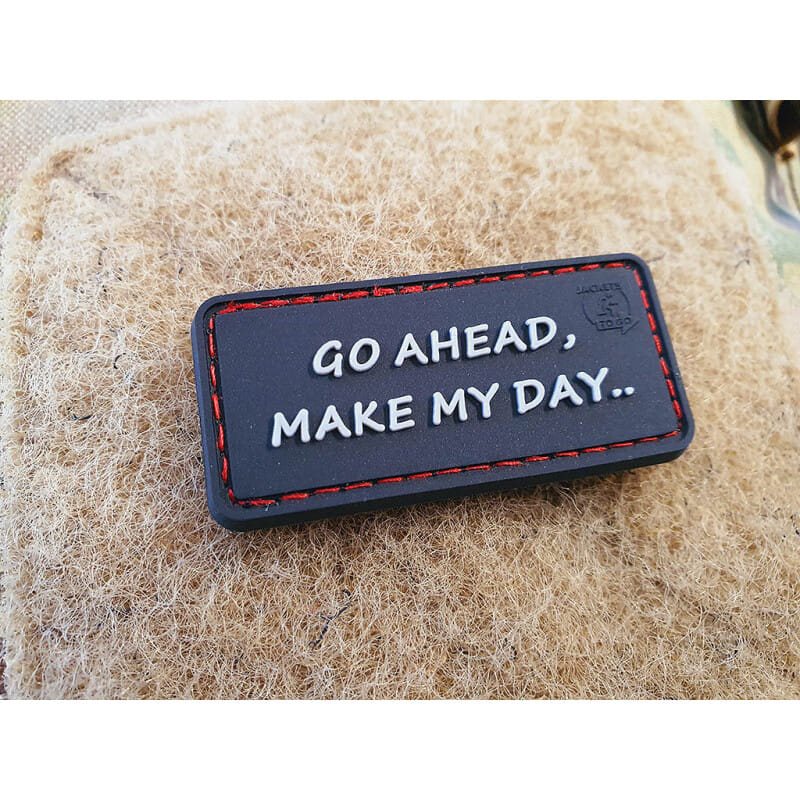 Top patch 3D di alta qualità, cucito con filo rosso, con velcro sul retro. La scritta sul patch "Go Ahead, Make My Day" potrebbe essere tradotta in italiano con "Avanti, rendimi felice". Si tratta di una battuta tratta dal film Sudden Impact (in Italia distribuito con il titolo "Impatto improvviso").