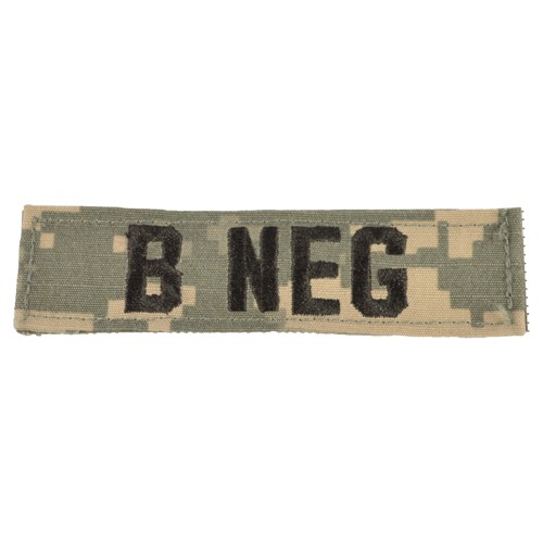Patch con indicazione del gruppo sanguigno. Sul retro è dotato di chiusura in velcro. Dimensioni: circa 10 x 2,5 cm. Tessuto mimetico UCP - ACU Digital, versione rip-stop.