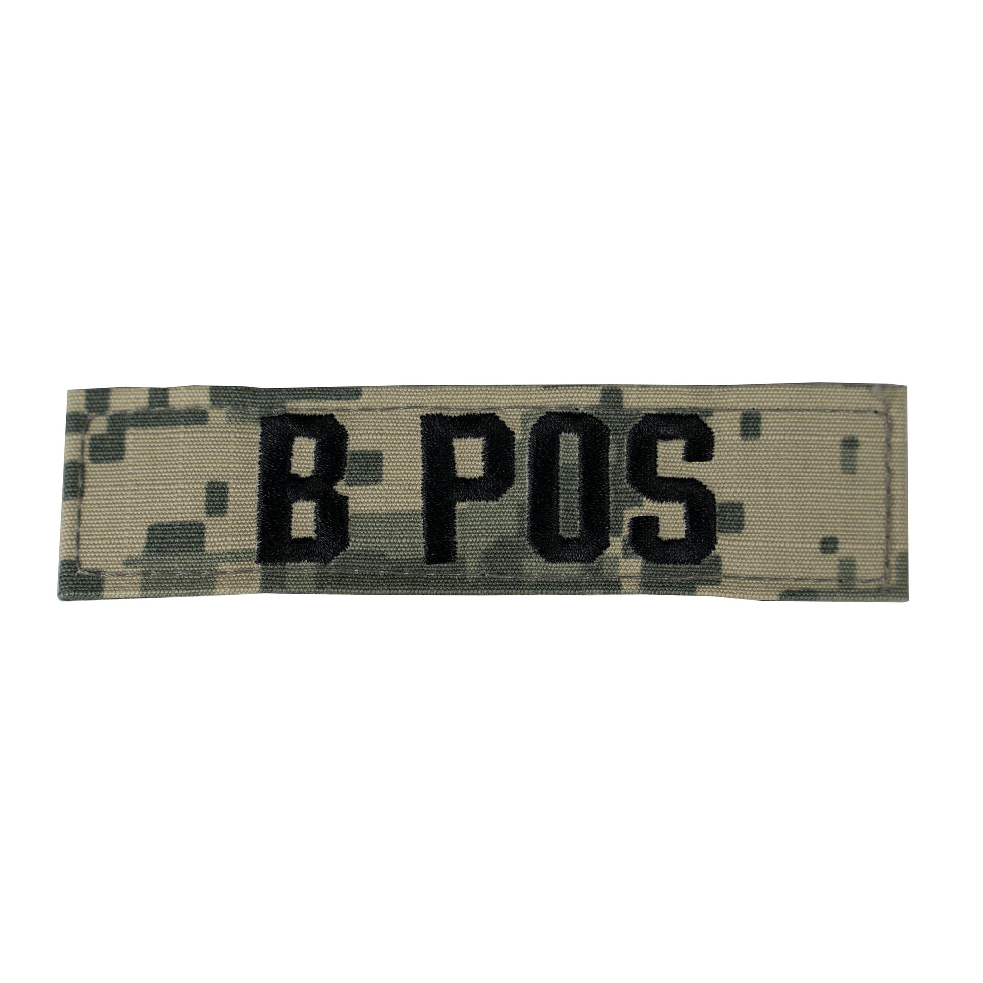 Patch con indicazione del gruppo sanguigno. Sul retro è dotato di chiusura in velcro. Dimensioni: circa 10 x 2,5 cm. Tessuto mimetico UCP - ACU Digital, versione rip-stop.