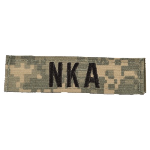 Patch con la scritta NKA (No Known Allergies), che indica che non si soffre di alcuna allergia. Sul retro è dotato di chiusura in velcro. Dimensioni: circa 10 x 2,5 cm. Tessuto mimetico UCP - ACU Digital, versione rip-stop.
